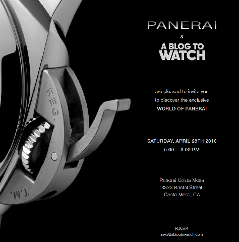與來自 aBlogtoWatch 的鐘表愛好者和我 (Ariel Adams) 一起來慶祝南加州對高級制表的贊賞。該活動將于太平洋標準時間下午 5:00開始,并于晚上 8:00結束。由于空間有限,請回復。我代表沛納海和 aBlogtoWatch 團隊,期待在活動中見到您。