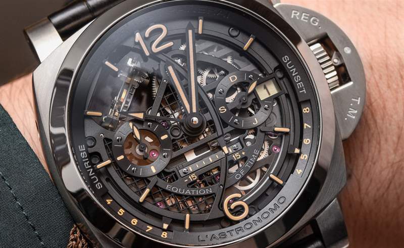 說到表盤,我們有更多的復雜性需要考慮,包括帶有小秒盤的時間、第二時區指針(12 小時格式)、月份指示器、日期(稍后會詳細介紹),正如我所說,時間方程和日出/日落指示器,都使用漂亮的線性刻度。重要的是要考慮到所有沛納海 L’Astronomo Luminor 1950 Tourbillon Moon Phases Equation Of Time GMT 手表都將按訂單生產。造成這種情況的最大原因之一是日出和日落指示器。這些功能需要針對世界的特定地區進行校準(只有具有這些復雜功能的數字手表才能針對不同的城市進行調整——換句話說,不同的經緯度坐標)。廣告訊息廣告信息結束