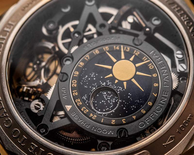 當沛納海首次推出 L’Astronomo Tourbillon 時,他們聲稱它的靈感來自伽利略·伽利略(出于明顯的天文原因)。除了時間等式復雜功能外,從手表的正面看,手表的天文功能并不容易看到。當然,表盤外圍還有日出和日落指示器,至少需要復雜的日歷功能。將 PAM920 背面翻轉,您會看到這款手表的最新元素之一,即月相指示器——這與之前 2010 年型號的星圖不同。在太陽的對面,月相盤本身非常精美,并且每 24 小時轉動一次,作為時間的額外指示。