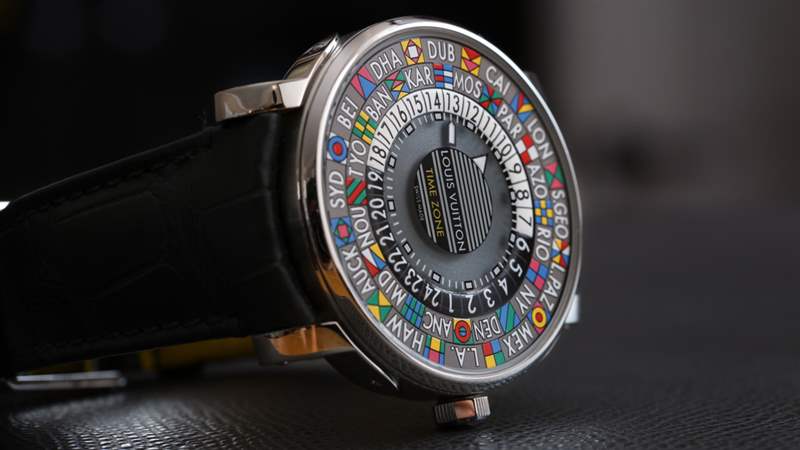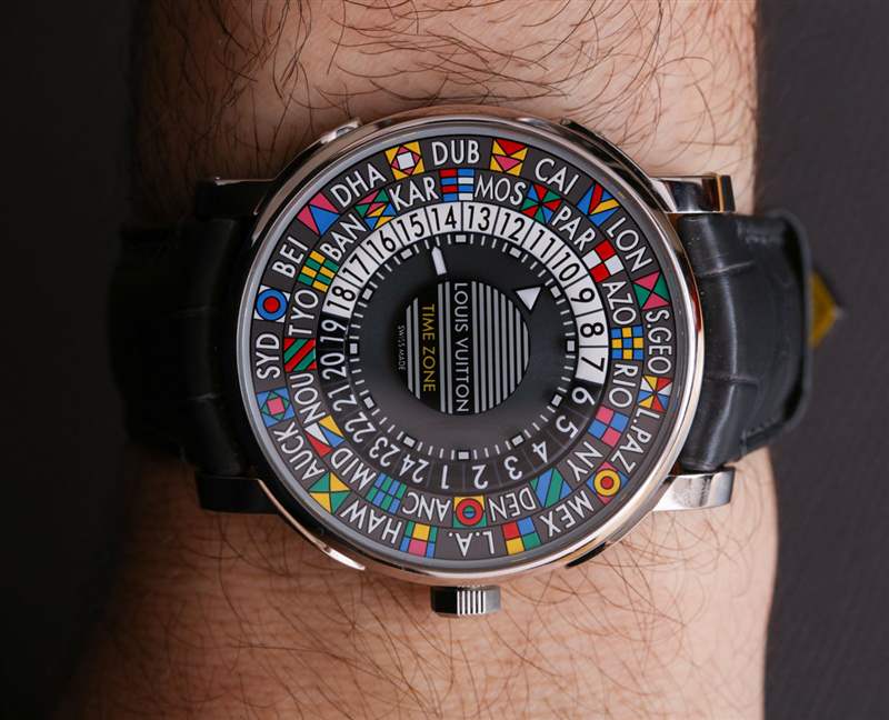 先介紹一些歷史和背景。路易威登的許多手表都受到他們昨天的行李箱和行李箱系列的啟發(fā)。這些是手工制作的產(chǎn)品,幫助這家法國(guó)奢侈品牌登上了地圖。產(chǎn)品中這種影響的一個(gè)例子是凸耳。這些凸耳分別連接在表殼的側(cè)面,旨在模仿該品牌歷史悠久的行李物品上金屬硬件的外觀。對(duì)路易威登行李箱世界的另一個(gè)致敬是五顏六色的“旗幟”,它們位于世界時(shí)間盤上參考城市名稱的上方或下方。我不是路易威登復(fù)古行李箱的專家,但我的理解是,這些小旗幟可以在一個(gè)人旅行到一個(gè)城市后涂在行李箱上(并且似乎受到海上旗幟世界的啟發(fā))。