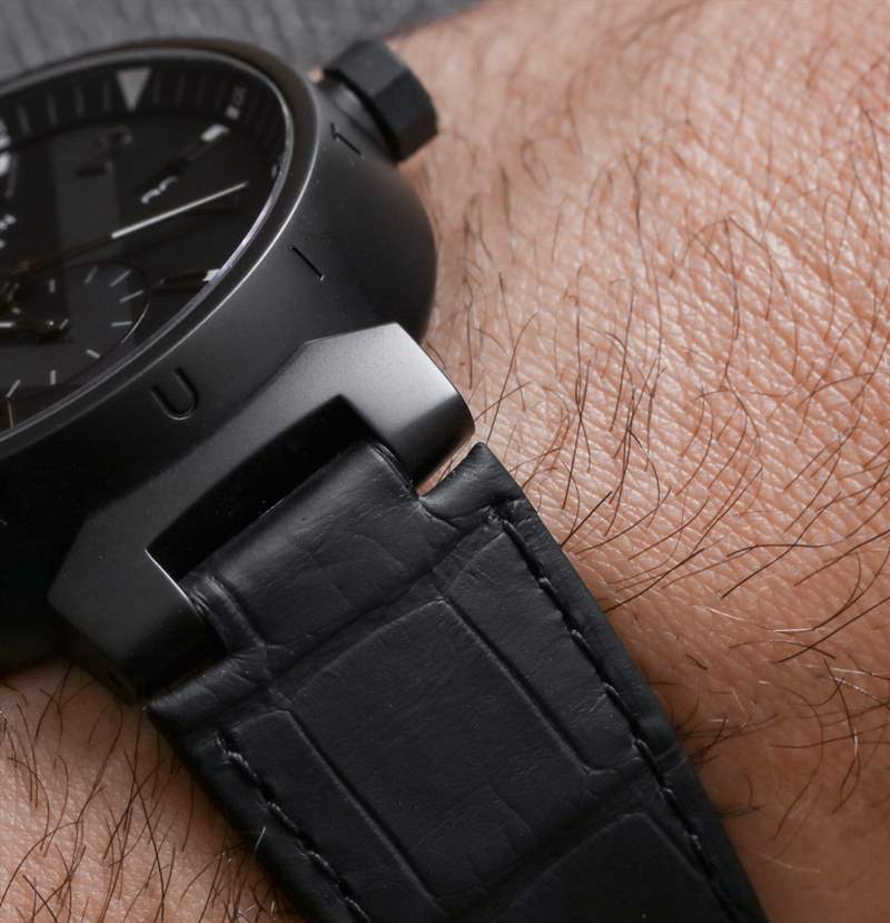 如果您想要更大的表殼佩戴體驗,Tambour All Black Chronographe 采用 46 毫米寬的表殼(確實感覺更大)。對我來說,Tambour 的理想表殼尺寸仍然是 44 毫米寬。All Black 精鋼表殼的啞光黑色飾面做得很好,并使用 PVD ??應用工藝進行應用。表帶扣是 DLC 涂層的黑色,這可能是一件好事,因為它提供了更多的耐磨性,而帶扣往往會導致鐘表的大部分磨損。