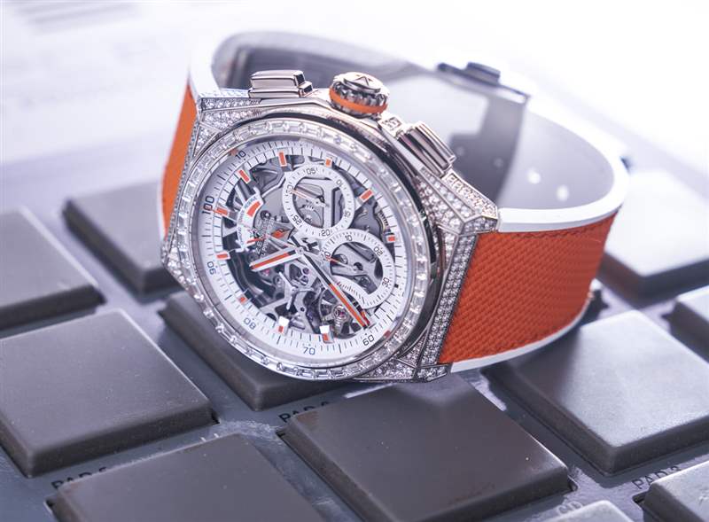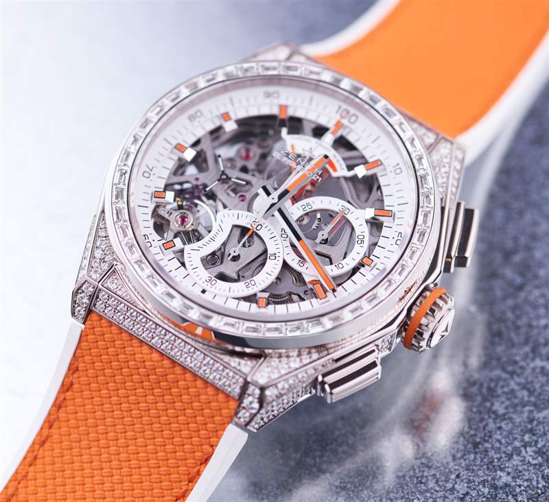 44 毫米寬的 18k 白金鑲有高雅的鉆石,這正是 Swizz Beatz 想要這款腕表的裝扮。當鉆石成為桌面上的一種選擇時,真的很難說不。我個人喜歡鑲嵌在表殼中的圓形切割寶石(其中 288 顆,約 2.55 克拉)與鑲嵌在表圈中的更大(更陽剛)長方形切割鉆石(其中 44 顆,約 2.46 克拉)的組合。與表盤上的橙色強調色相匹配的是帶有橙色織物襯里的白色橡膠表帶。Swizz Beatz 認為橙色是他最喜歡的顏色之一,更重要的是,他在心情愉悅時首選佩戴諸如此類的彩色時計。