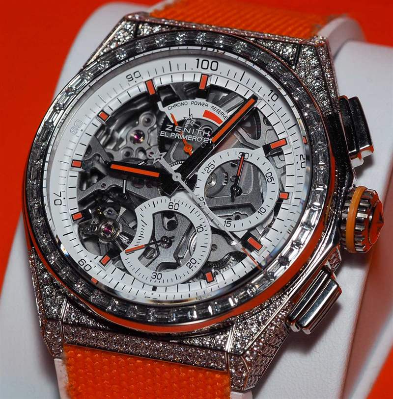 Zenith Defy El Primero 21 Swizz Beatz 時計 – 在一個項目中 – 似乎結合了 Swizz Beatz 在手表中熱衷的各種元素。它從 Zenith Defy El Primero 21 內部的內部 El Primero 21 自動機芯開始(aBlogtoWatch 在此處動手操作).?通過兩個調節系統,手表使用“高節拍”5Hz 振蕩器來調節主時間,以及更快的 50Hz 速度振蕩器,使 1/100 秒計時碼表成為可能。真力時不僅為限量版腕表制作了新的表盤顏色,還為 Swizz Beatz 修改了 Defy El Primero 21 的表盤。這為機芯提供了一個受歡迎的視角,這對 Swizz Beatz 來說很重要,因為在他看來,真力時所采用的原創和獨家技術是該品牌最強大的亮點之一。