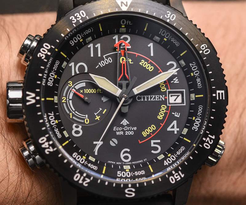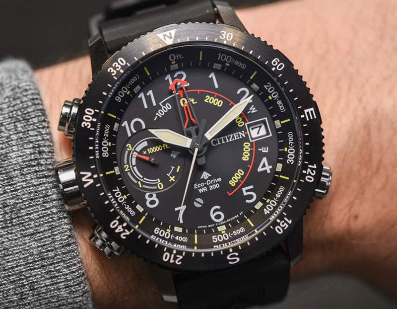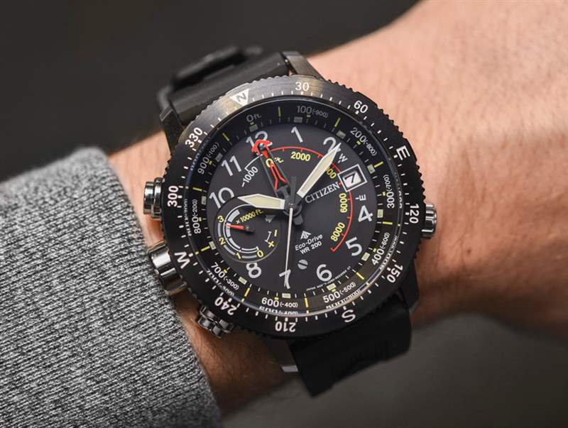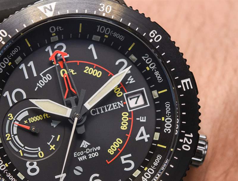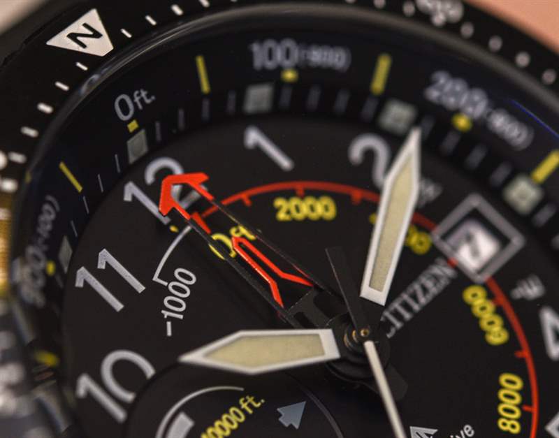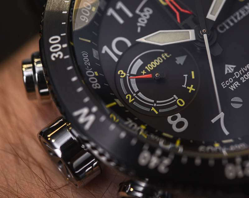 話雖如此,表盤的絕對深度并沒有讓 Altichron 感覺像其他任何東西。表盤需要這么深,因為中心柄需要容納五只手,再加上表盤上的第六只手,用于多功能輔助表盤。您還可以得到日期。據(jù)我了解,這款更新的 Promaster Altichron 的機芯沒有變化,它繼續(xù)包含 Citizen caliber 3290 Eco-Drive 石英機芯。除了時間、指南針、高度計(可以測量高達 32,000 英尺的非常大的部分)和日歷外,表盤還有一個用于電池壽命的動力儲存指示器。