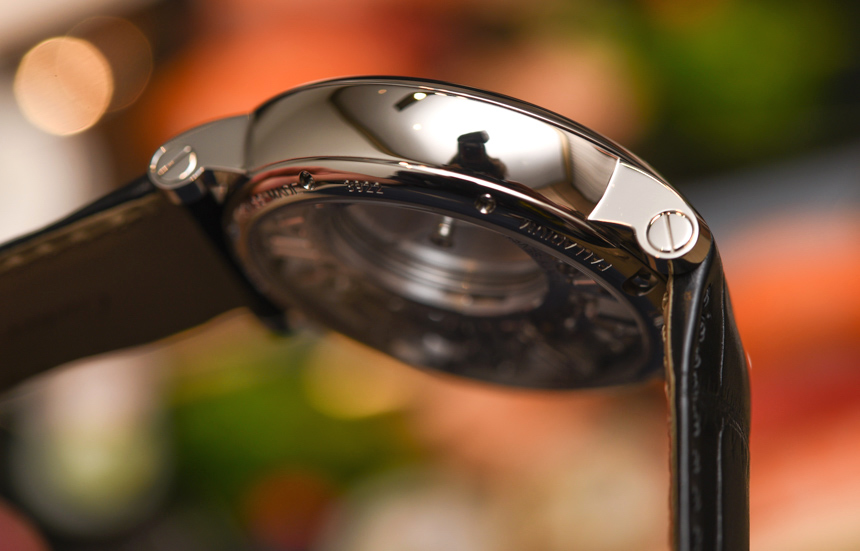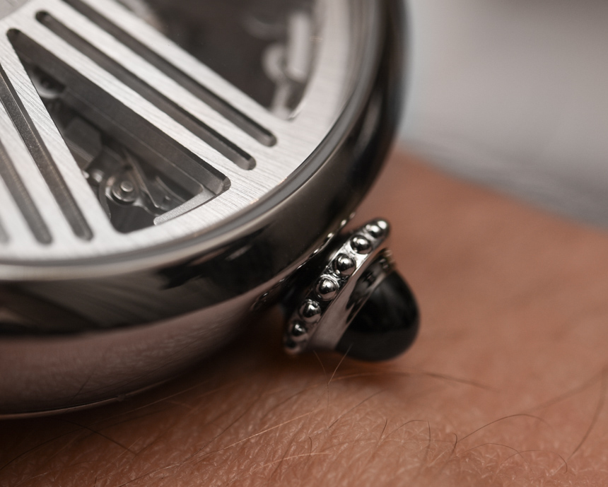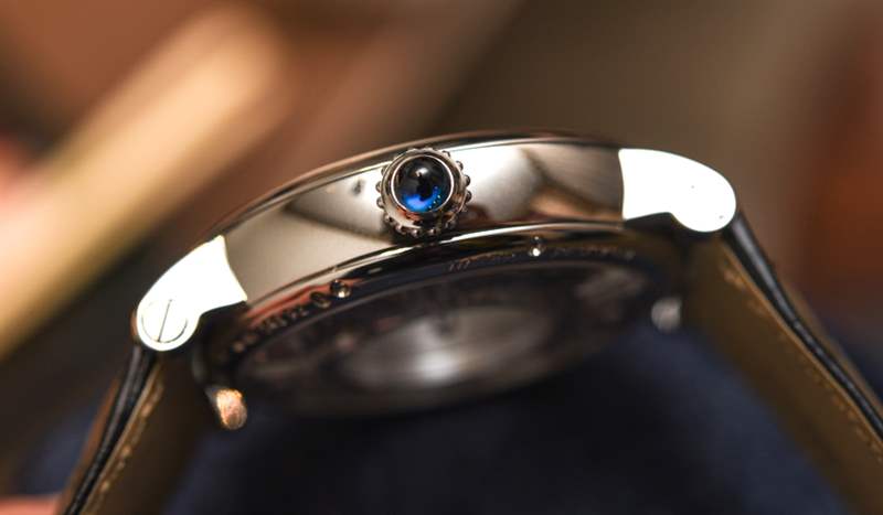 Rotonde de Cartier Mysterious Hour Skeleton 采用 42 毫米寬的鈀色(我相信現在是唯一的),與任何 Rotonde 型號一樣耐磨且舒適。為什么是鈀?好問題; 卡地亞可能想知道您是否發現這種異國情調且實用性有問題的稀有材料是獨一無二的。圓形表殼帶有一點法國風情(盡管它是瑞士制造的),其標志性的卡地亞風格表冠帶有藍色藍寶石水晶凸圓形寶石(請注意,過去卡地亞主要使用藍色藍寶石水晶作為凸圓形寶石,只是它更高-如今的終端型號采用藍寶石,而更多主流型號則采用藍色尖晶石),以及與表耳相匹配的迷人圓形表圈。
