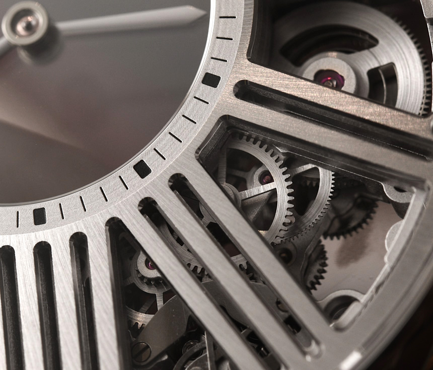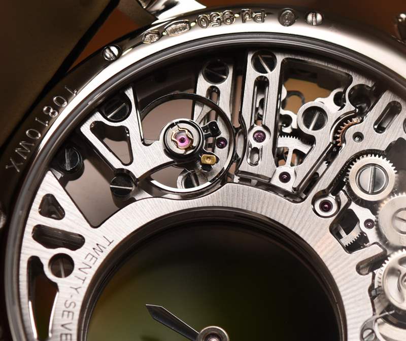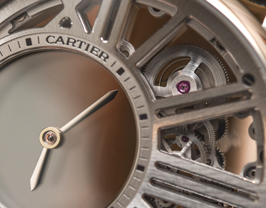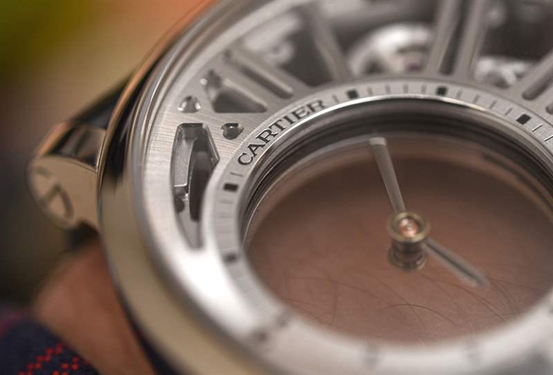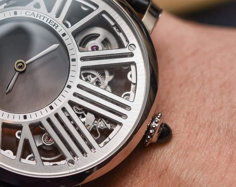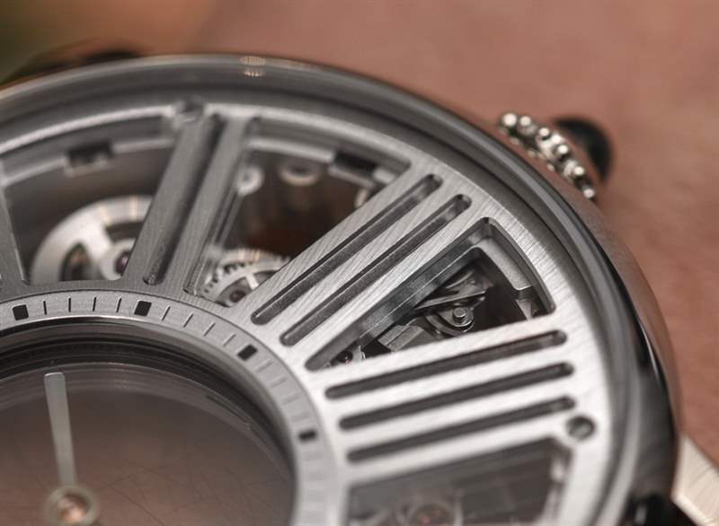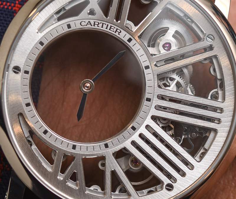 機芯采用兩塊藍寶石水晶板,指針置于其上。中間有一個傳統的安裝系統,兩個藍寶石水晶圓盤的中心軸點連接。小時和分鐘表盤右側的齒輪移動這些圓盤,進而移動指針。構成所有這一切的框架,以及機芯的一部分,是手工完成的盤子,其中包括“結構”羅馬數字圖案。整體外觀很棒,盡管它不是人們在想象手工完成的機械表機芯時可能會考慮的常見裝飾風格。在鏤空表盤和機芯方面,卡地亞選擇了更現代、可以說是男性化的外觀,因為它具有獨特的美感。