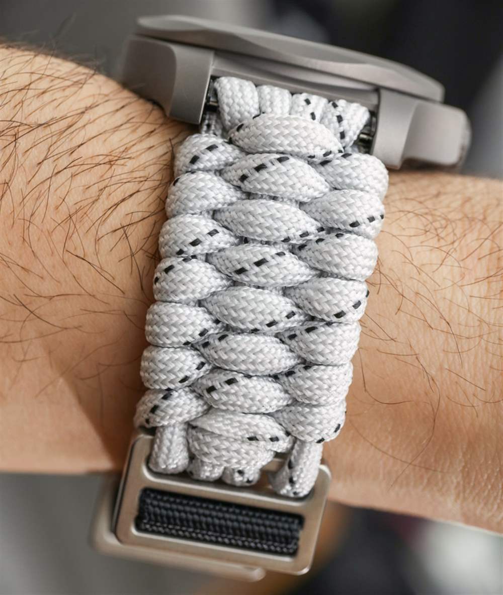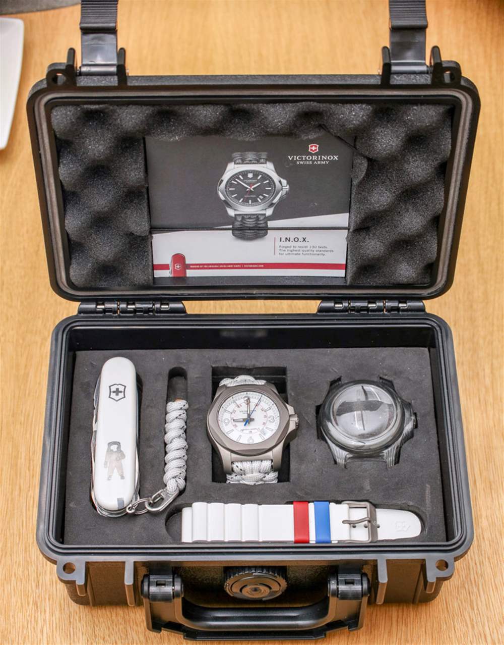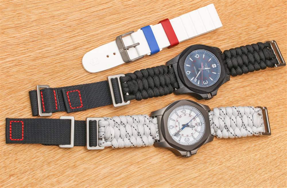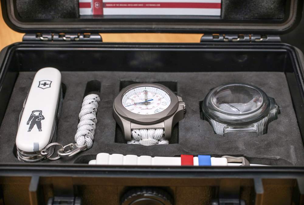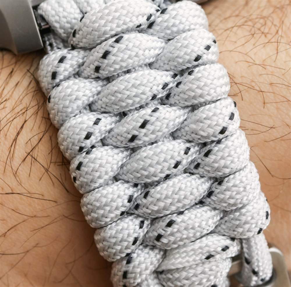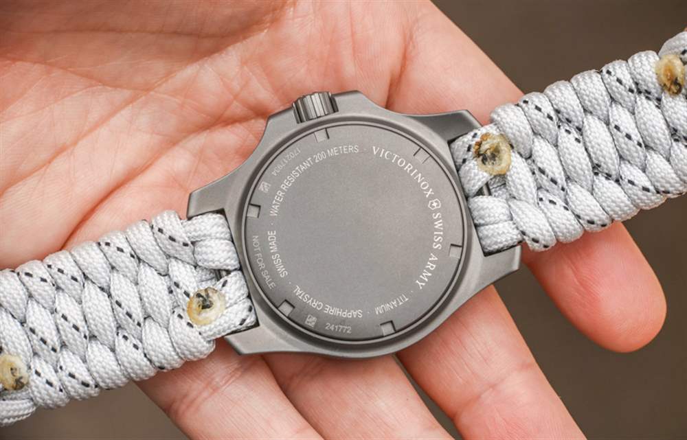 INOX Sky High 提供軍用風格的白色碳纖維表盤,單獨搭配帶斑點的白色傘繩表帶(包含對位芳綸纖維 – 顯然比鋼強 8 倍)。在盒子里,你還會得到一條白色橡膠表帶(帶有藍色和紅色表帶環,有點酷),以及一把帶有傘繩附件的限量版小型瑞士軍刀。根據 Victorinox 的說法,我對這個系列的唯一抱怨是無法真正幫助的。基本上它與傘繩帶的底面是黑色織物而其余部分是白色的事實有關。這并不可怕,但如果搭配白色會更好。