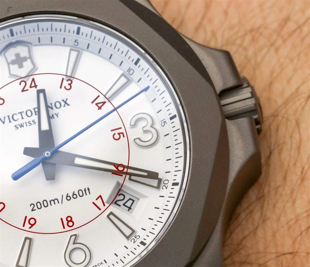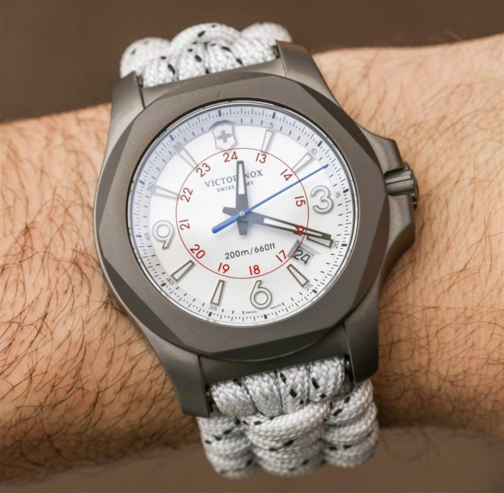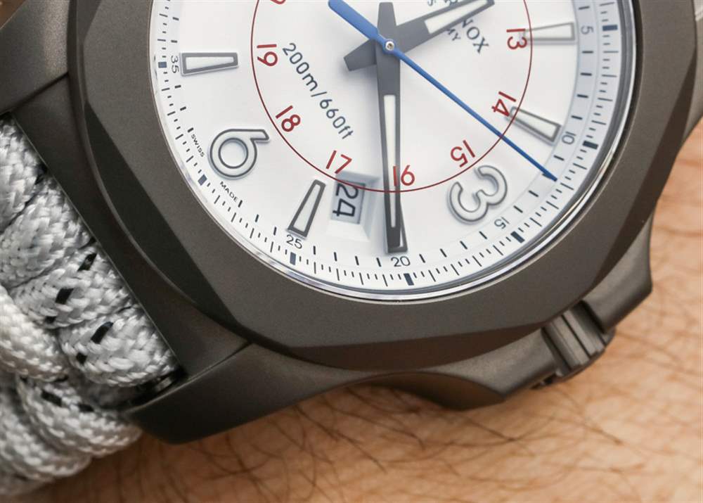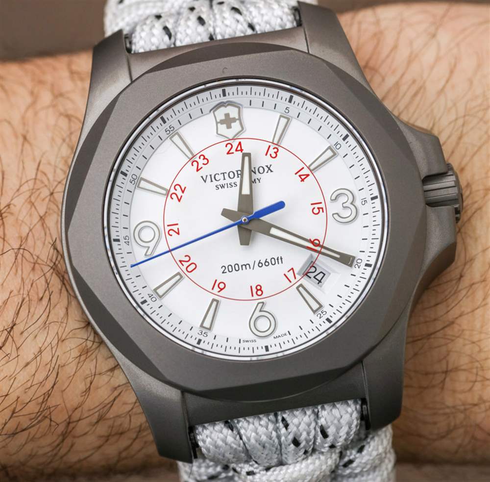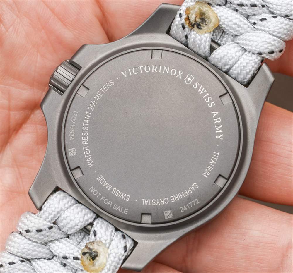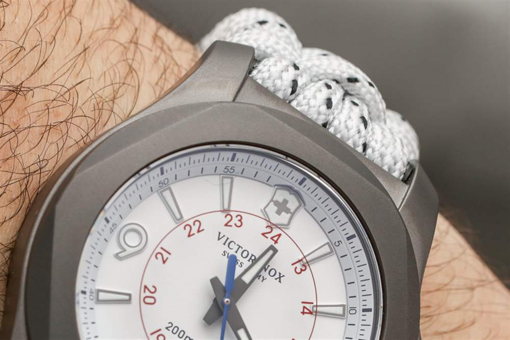 INOX Titanium Sky High 不是關于新零件,而是更多關于現有組件的有吸引力的管理——可能會以新的顏色呈現。INOX Sky High 主要基于 2016 年底發布的 INOX 手表型號,即Victorinox Swiss Army INOX Carbon。手表共享表盤樣式和 Naimakka 傘繩表帶。雖然 Carbon 有這些是黑色的,而 Sky High 有它們是白色的。兩款腕表的主要材質差異在于 INOX Carbon 采用鍛造碳表殼,而 INOX Sky High 采用噴砂鈦金屬表殼。盡管 Carbon 不是限量版,但在 Naimakka paracord 表帶上,它實際上比 INOX Sky High 便宜 100 美元,我認為這是 Victorinox Swiss Army 碳纖維外殼成本的直接結果。