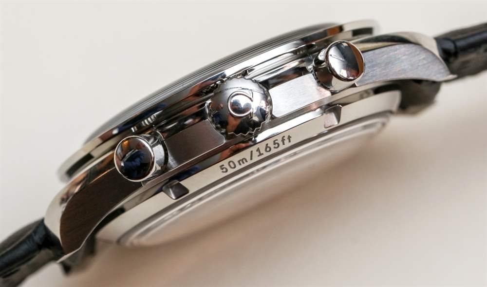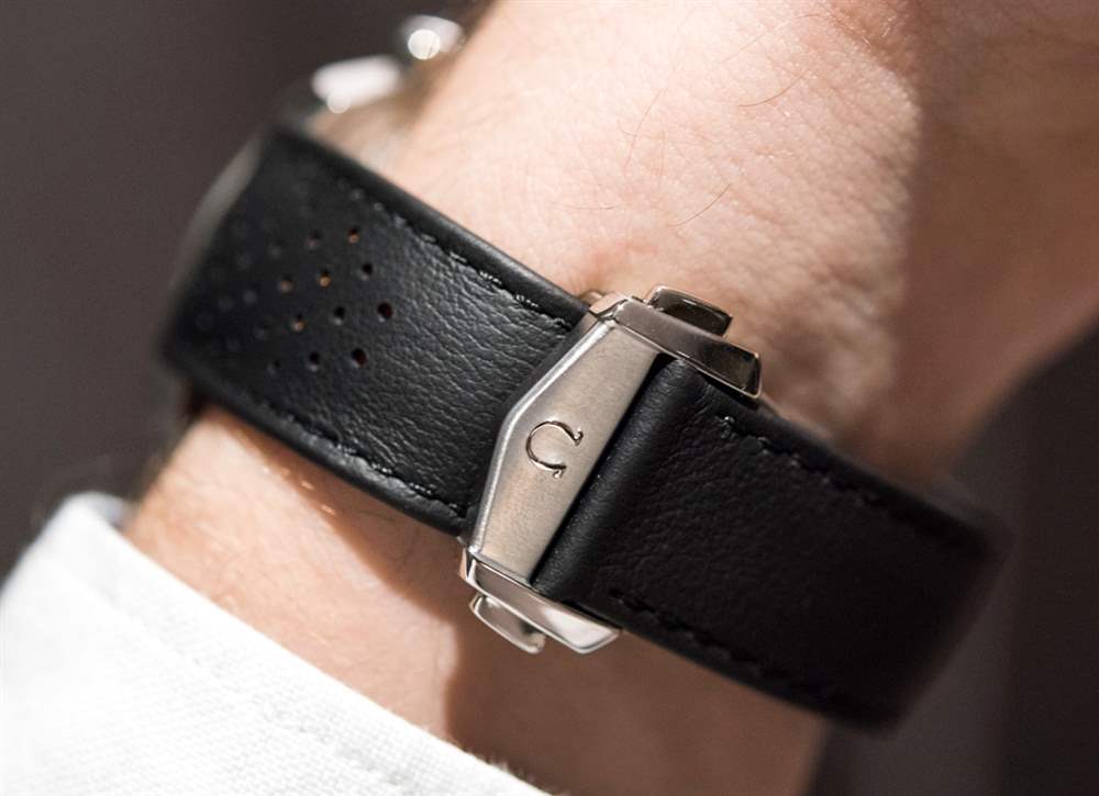 通過現在更圓潤的藍寶石水晶底蓋可以看到 9900 系列自動機芯。它以 4 赫茲(28,800 次/小時)的頻率運行,高于之前一些同軸擒縱 Omega 機芯的 3.5 赫茲。擒縱系統采用硅游絲,兩個主發條盒之間的動力儲存為 60 小時。該機芯具有帶小秒盤的時間,以及一個完整的 12 小時計時碼表,計時碼表分針和時針位于同一個(右)子表盤中。6點鐘有日期。該機芯既獲得了 METAS 認證,也獲得了 COSC 天文臺認證,盡管前者的認證使后者或多或少顯得多余。