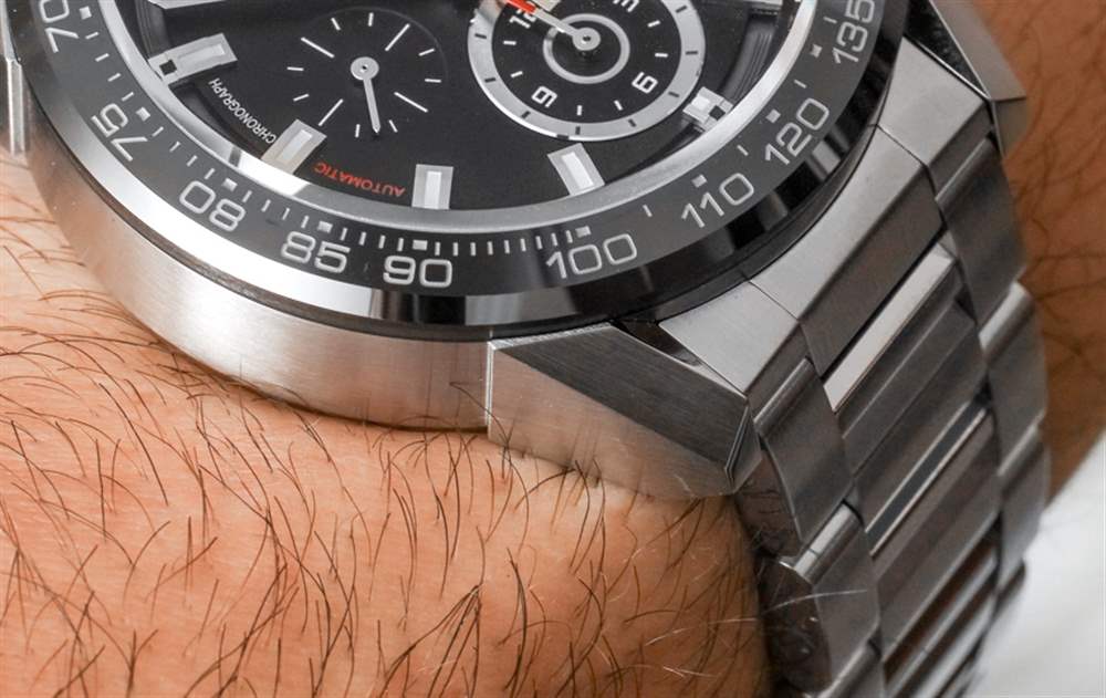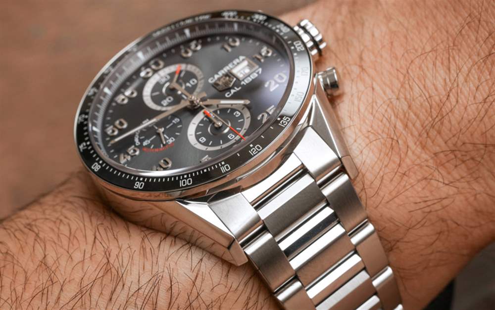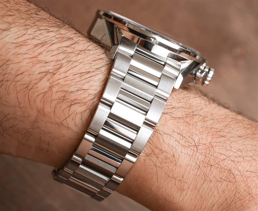 直接看手表時,與略顯柔和的 1887 相比,Heuer 01 版本的 Carrera 在線條上更加棱角分明,更具侵略性。這有點像將蘭博基尼的美學與法拉利進行比較。需要指出的是,TAG Heuer Carrera 1887的表鏈實際上比Carrera Heuer 01的表帶寬了一點,只是稍微改變了美學。話雖如此,這兩款手表都具有三鏈式拉絲和拋光精鋼表鏈,折疊式展開式表扣在設計上非常相似。但同樣,所有部分都是獨一無二的。