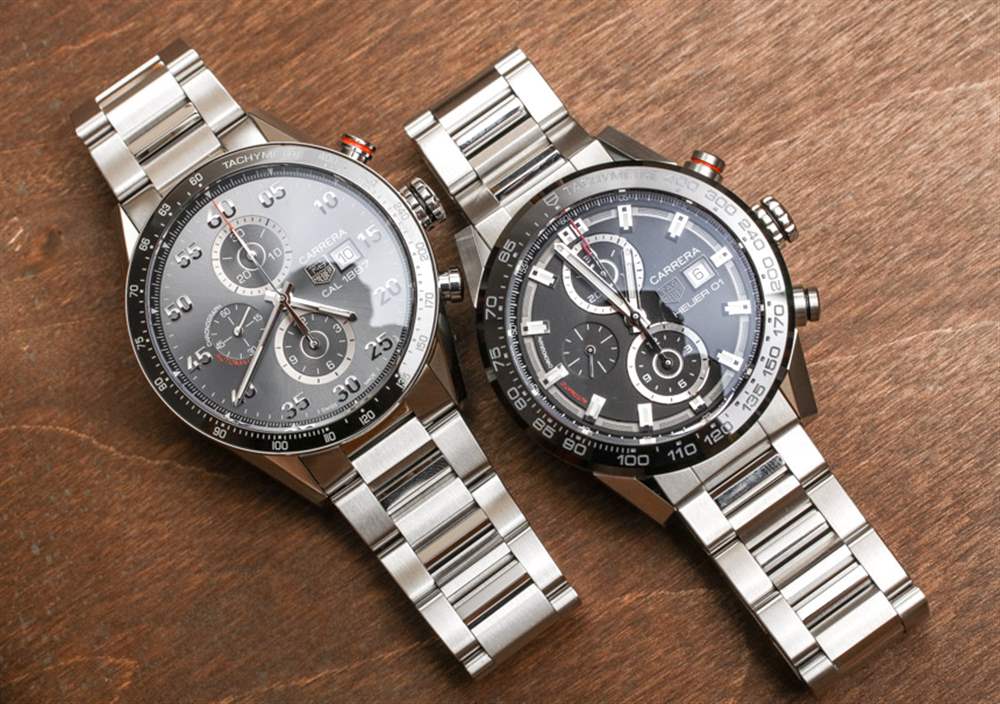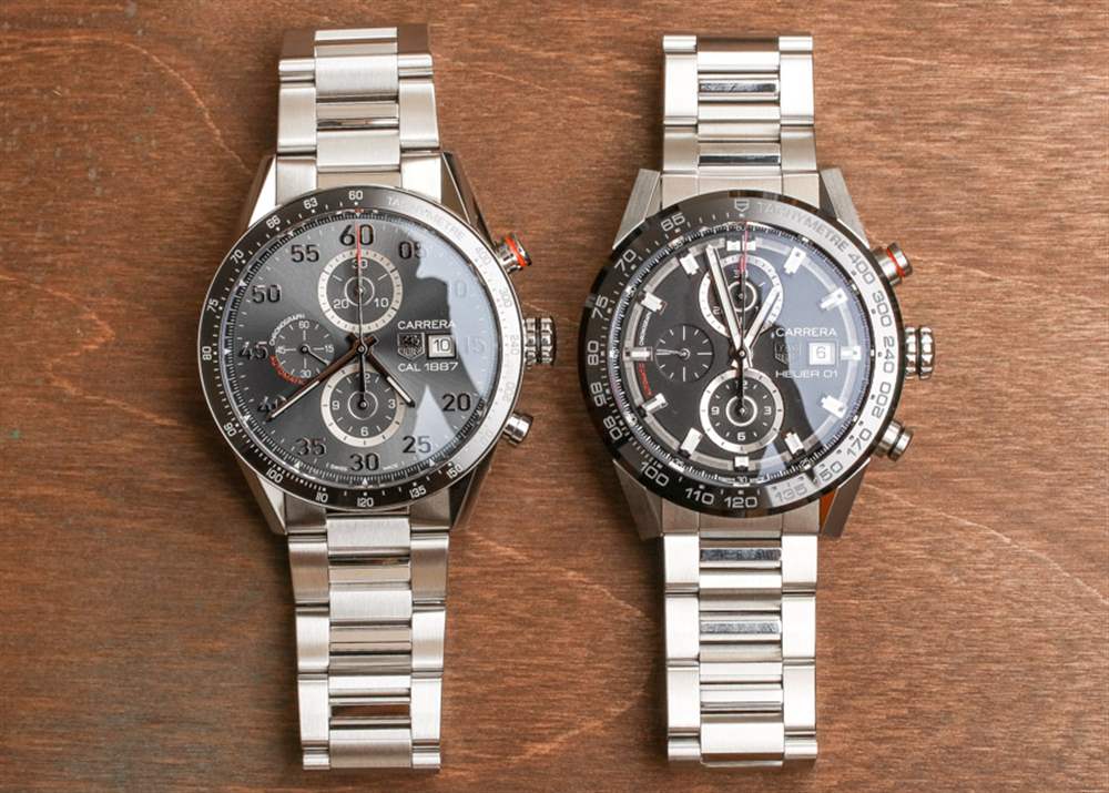 這兩款腕表分別是 TAG Heuer Carrera Calibre 1887 Automatic Chronograph 43mm reference CAR2A11.BA0799 和 TAG Heuer Carrera Calibre Heuer 01 Automatic Chronograph 43mm reference CAR201Z.BA0714。前一種型號是灰色表盤的,但泰格豪雅也生產幾乎相同的 Carrera 1887,全黑表盤(以及其他型號),型號為 CAR2A10.BA0799。