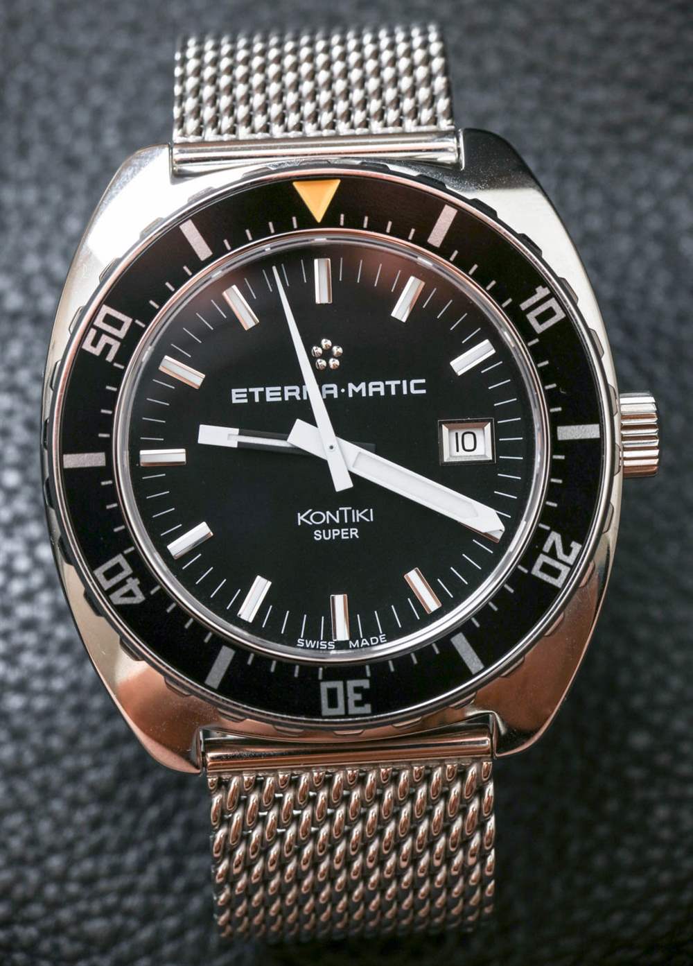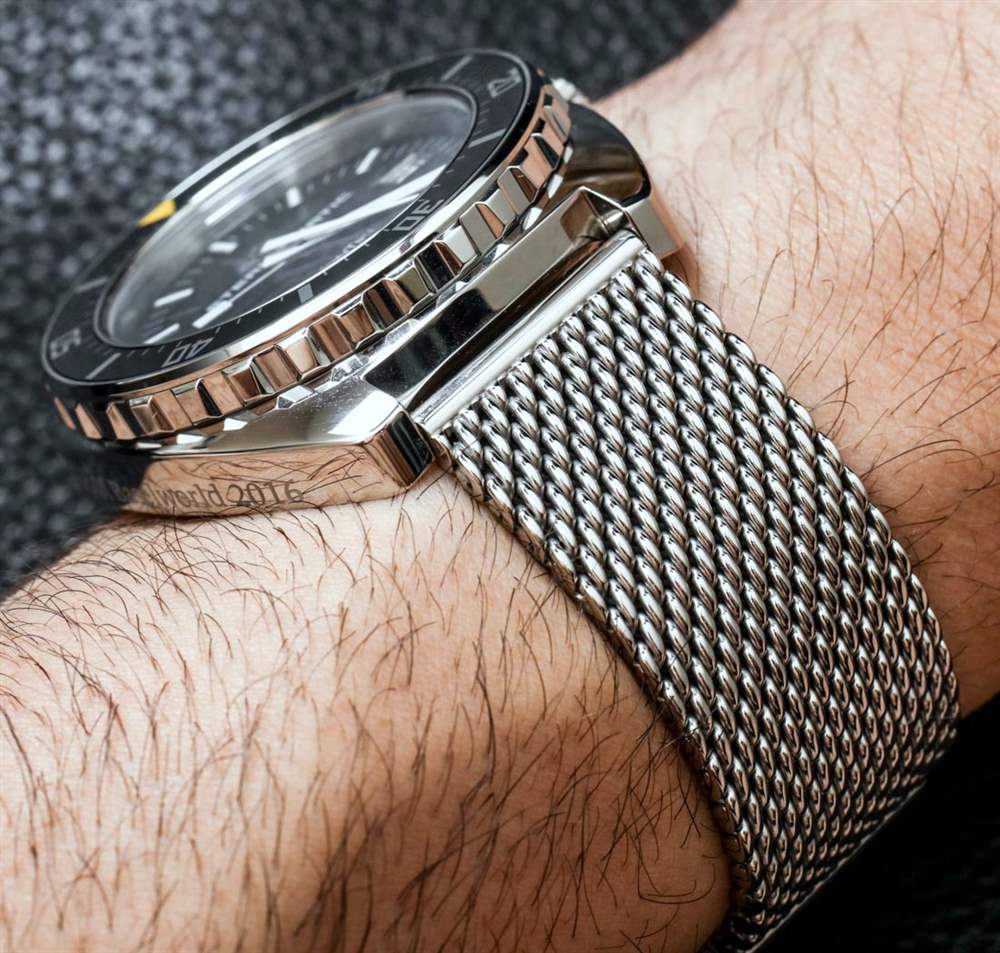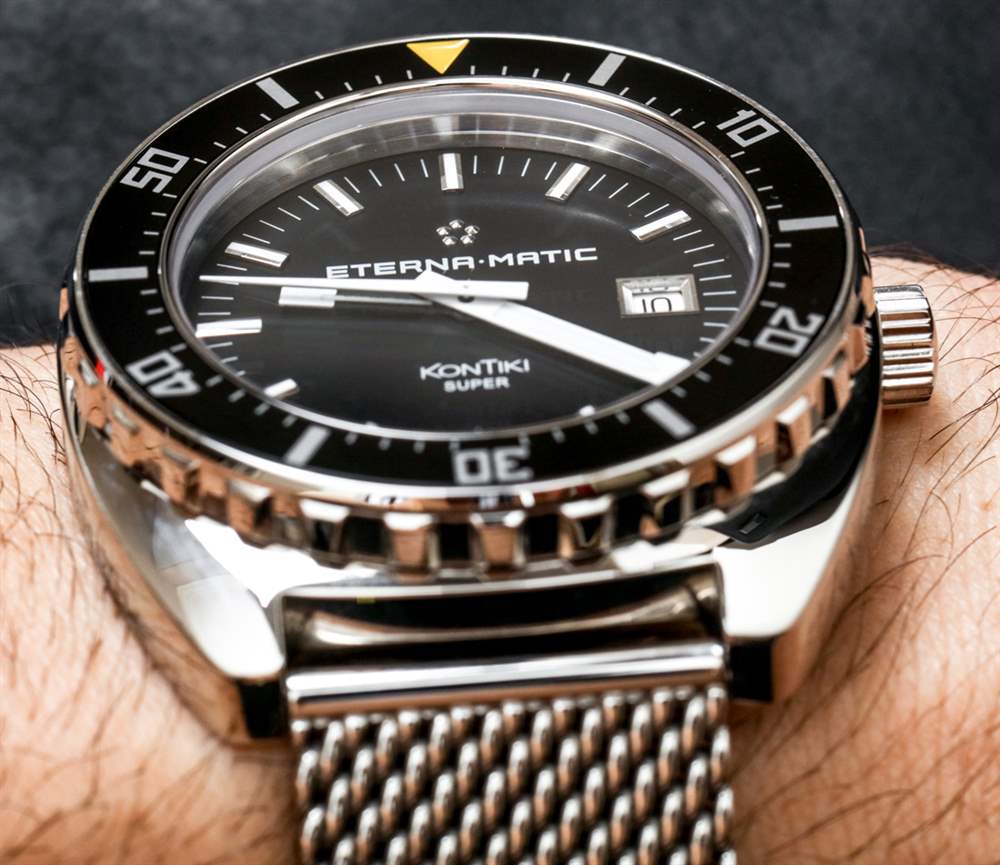 Eterna 為Heritage Super KonTiki 1973 提供了一款非常正宗的復古風格網狀金屬手鏈,它……嗯,很難調整尺寸。我們的每個團隊成員都選擇了不同的 Eterna 佩戴方式,但實際上我決定使用 Eterna 的不同網狀金屬手鏈,但它配備了更新的型號。我從Eterna Super KonTiki Date 手表上借了手鐲(aBlogtoWatch 評論在這里)。乍一看,這些手表非常相似。事實上,這兩款 Super KonTiki 型號均采用 200m 防水、44mm 寬的拋光鋼表殼,并具有相似的顏色主題。