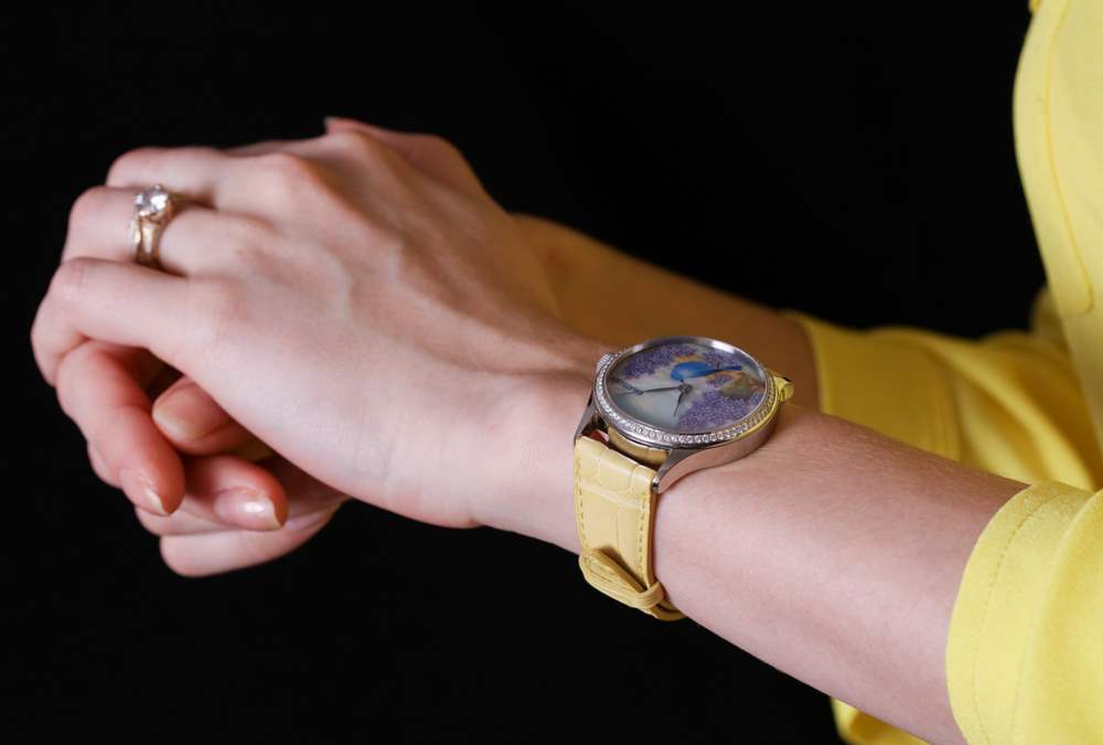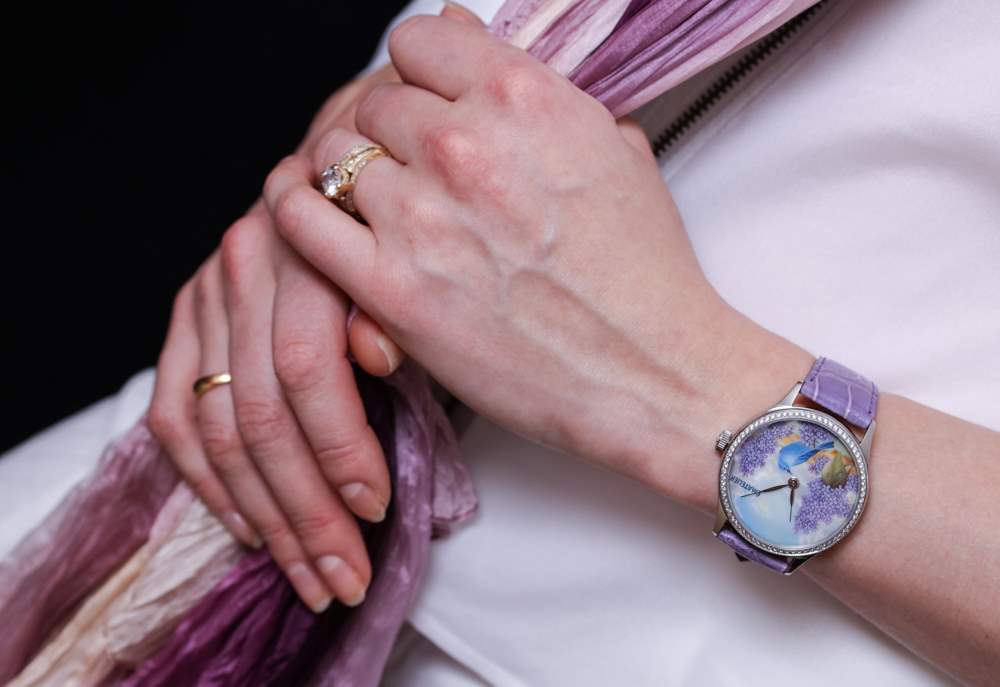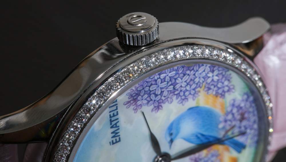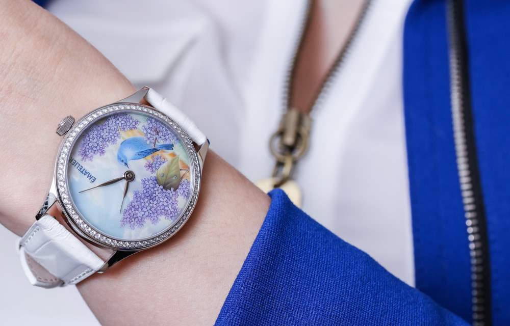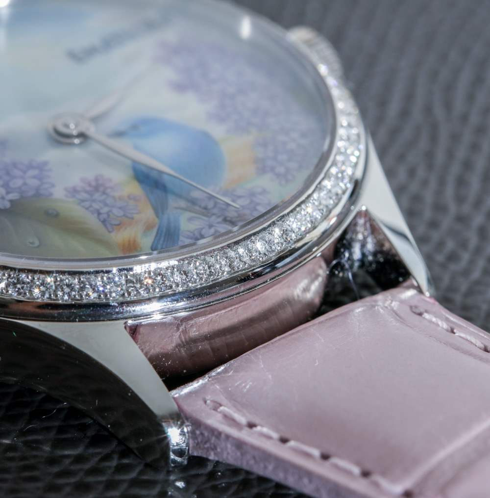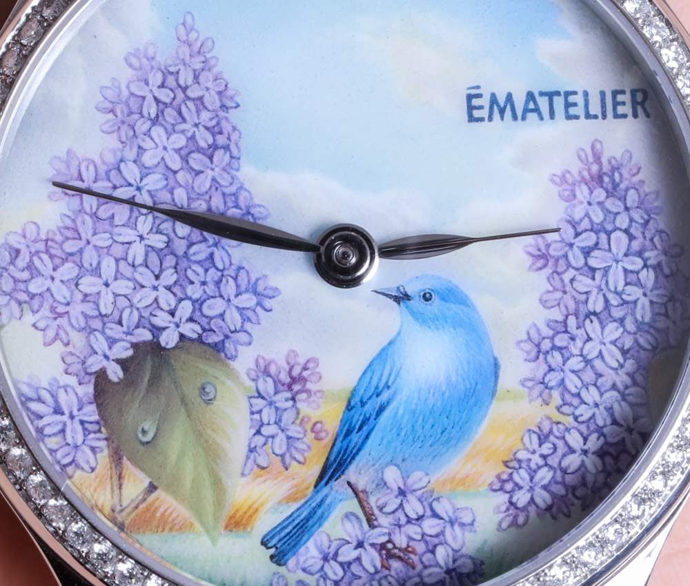 我正在寫的這款特別的手表被描述為 ématelier Harmony Lilacs and Bluebird。豐富的紫色和藍(lán)色組合在一起,融合了紫丁香的魅力、鳴禽的親切友好和鄉(xiāng)村景觀的寧靜。它描繪了一個可能確實存在于某個地方的奇幻地方,至少在大多數(shù)人的記憶中是這樣。