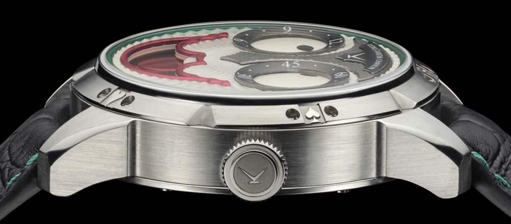 Konstantin Chaykin Joker 表殼的每一側都有一個表冠(實際上,左側只是一個用于調節月相的嵌入式推桿),用于充當這張臉的耳朵。表殼為鋼制,寬 42 毫米,厚 13.7 毫米。設計經典,但充滿活力,略帶運動感。表盤上方是藍寶石水晶,定制表帶是鱷魚皮,綠色縫線和深紫色小牛皮襯里。廣告訊息廣告信息結束