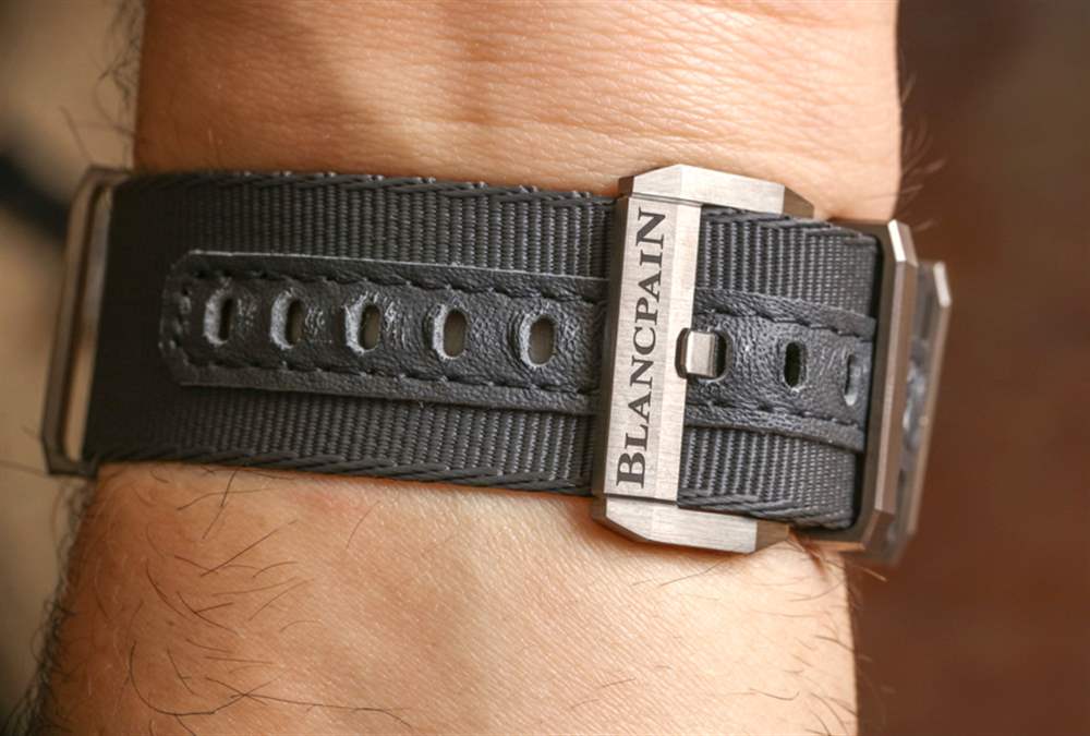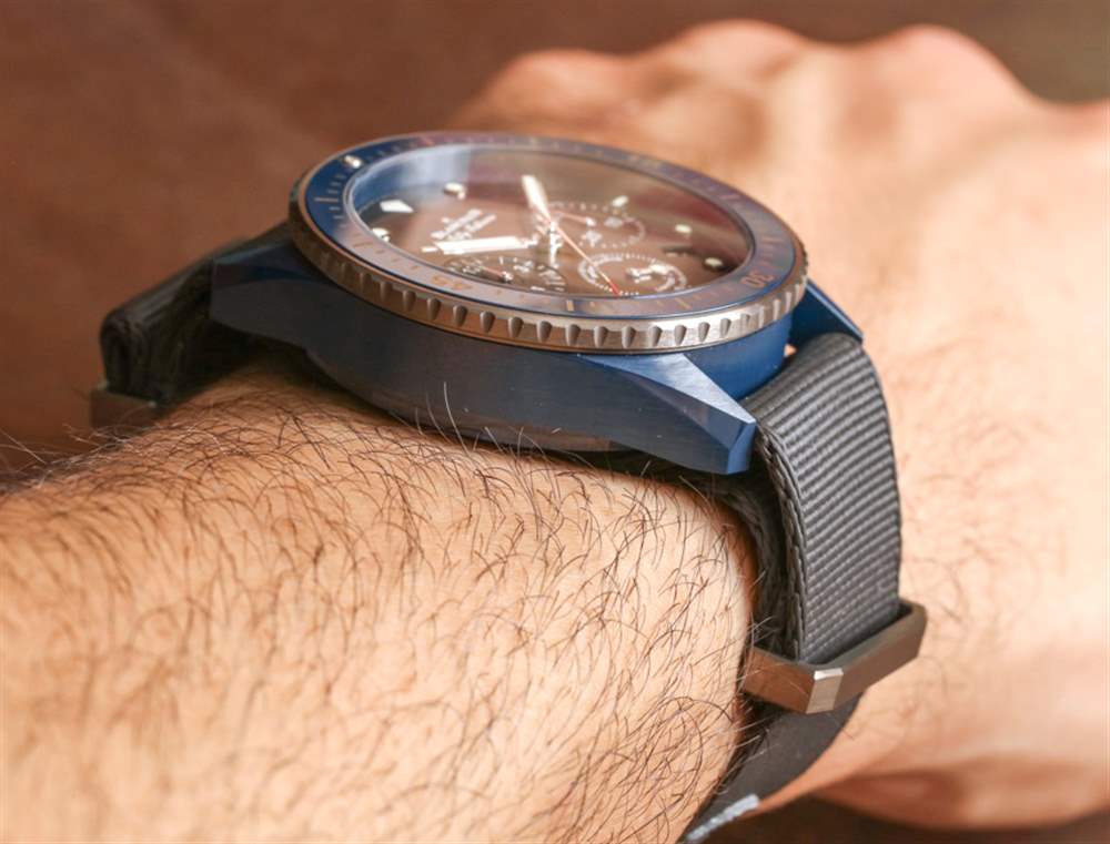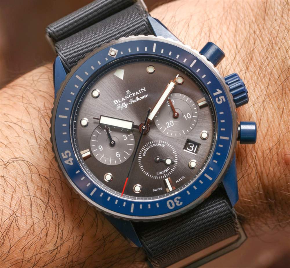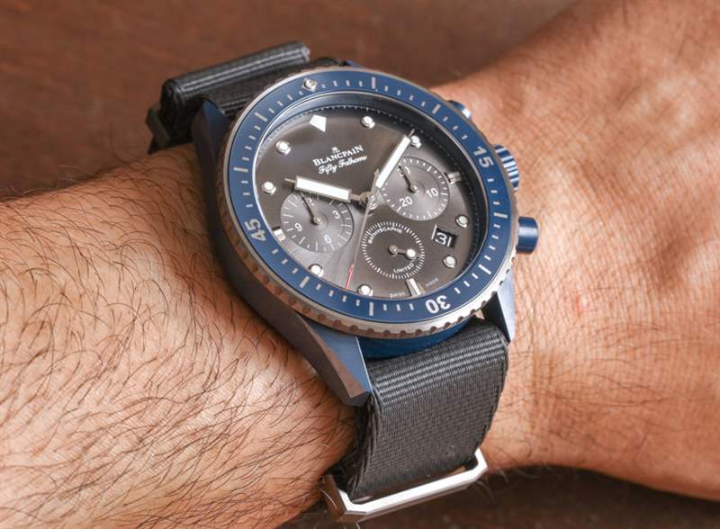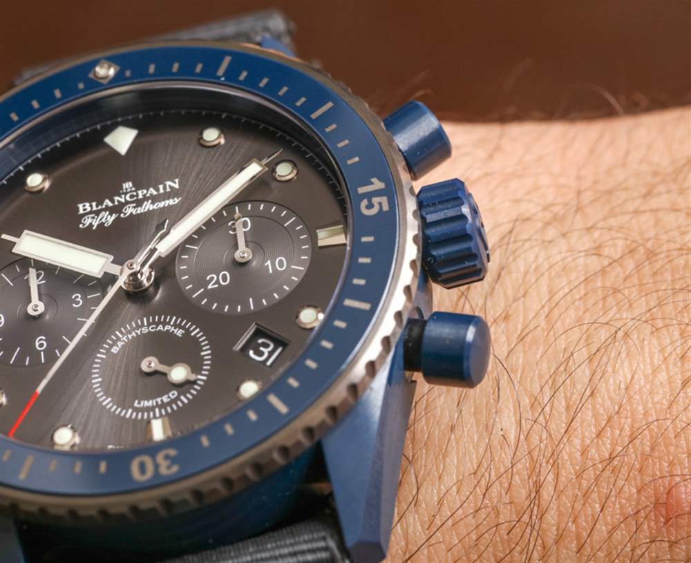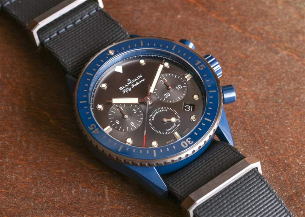 這是我戴過的第一個藍(lán)色陶瓷表殼(來自一個奢侈品牌),它看起來很棒——尤其是在有光澤的灰色調(diào)旁邊。在某些燈光下,藍(lán)色陶瓷看起來就像是黑色,但在光線充足的情況下,表殼材料的豐富藍(lán)色調(diào)就出來了。寶珀真的不能用藍(lán)色調(diào)淡一點,因為在生產(chǎn)方面它會使顏色變得太不穩(wěn)定。