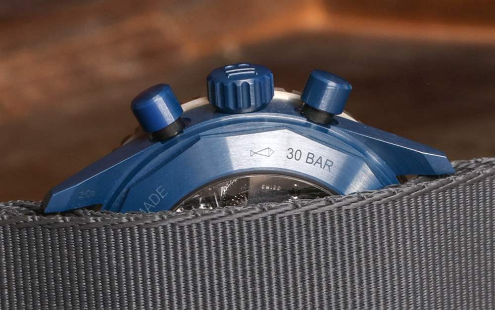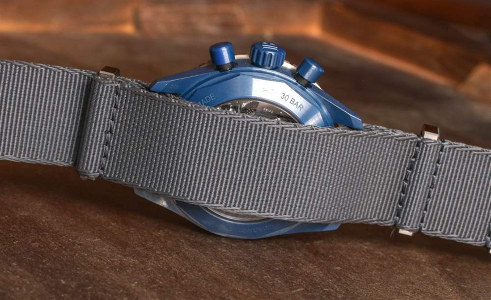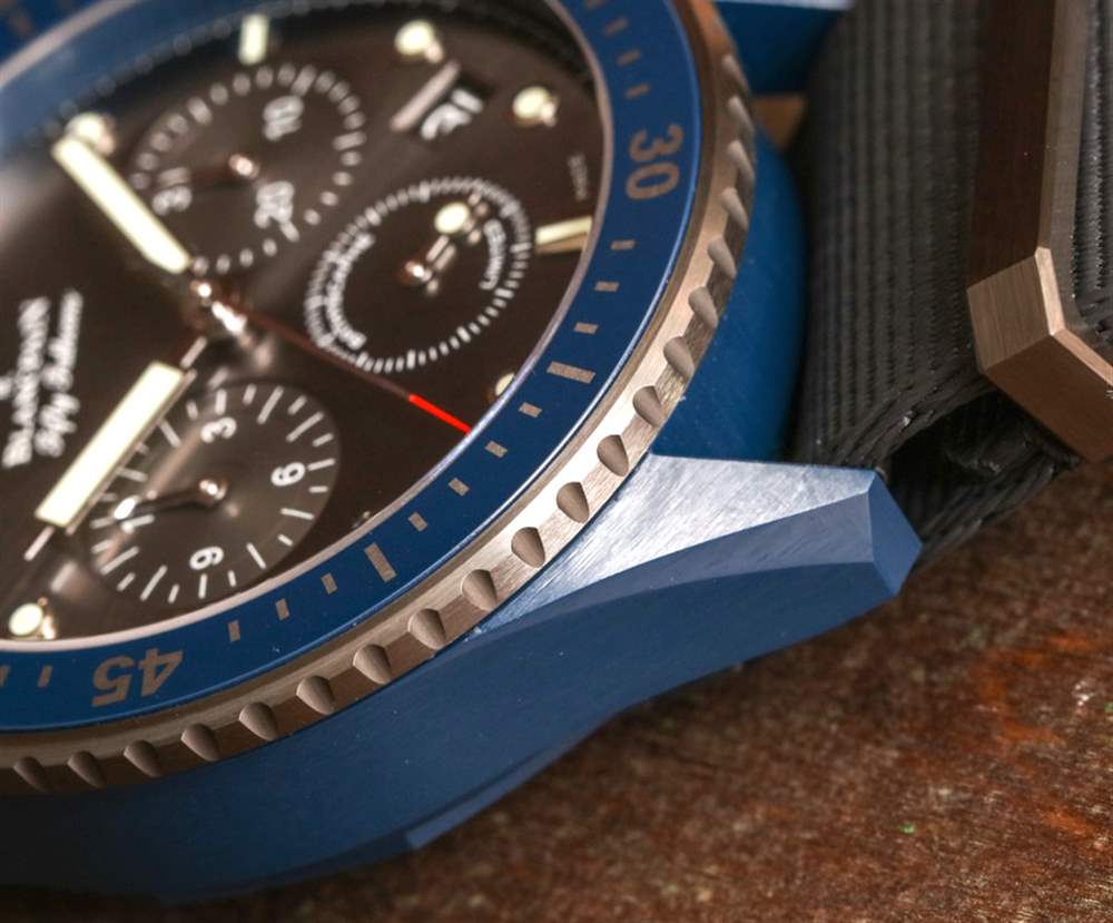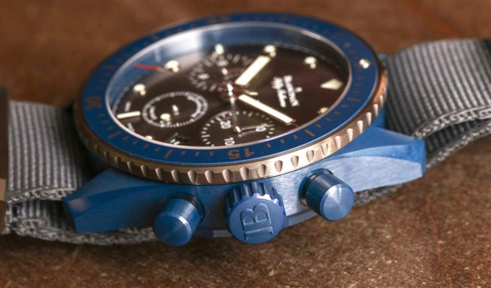 表盤周圍是平穩(wěn)操作的 120 次點擊、單向旋轉(zhuǎn)潛水員式表圈。外圈是鈦,液態(tài)金屬(與歐米茄共享的另一種技術(shù))和藍(lán)色陶瓷作為表圈的其余部分。表冠和按鈕也采用藍(lán)色陶瓷制成——同樣精美。