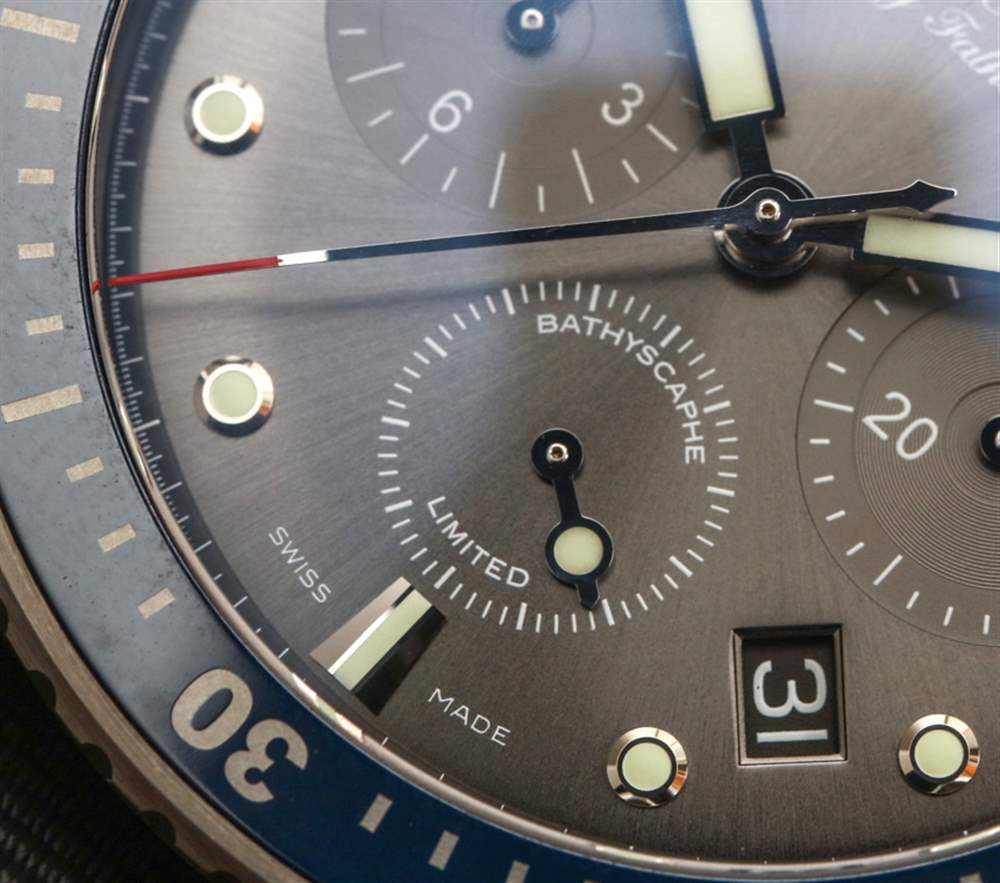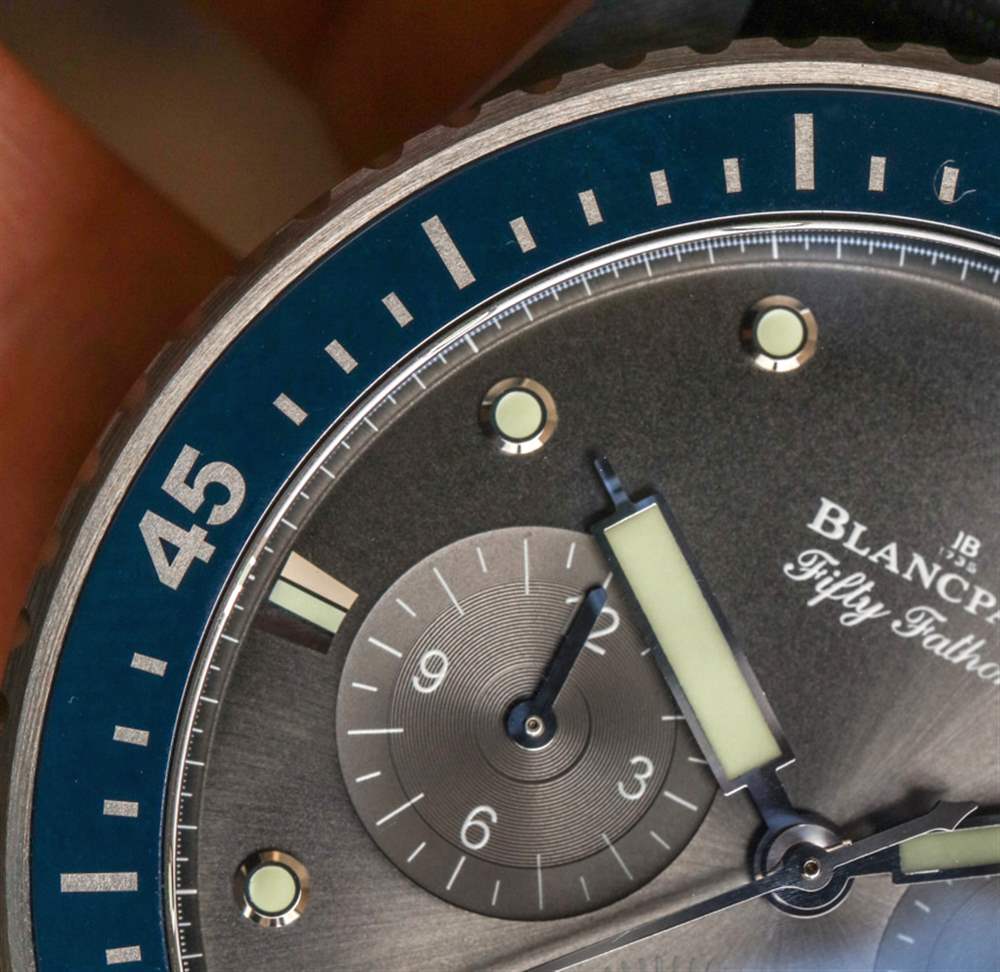 也許表盤上唯一有爭議的元素是日期窗口。它確實有助于手表的銷售具有日期復(fù)雜功能。寶珀沒有將日期窗口設(shè)計為表盤,這也很好。然而,日期窗口是傾斜的,所以它的位置在 4 點到 5 點之間讀取有點奇怪。此外,日期盤本身是黑色的,比手表本身的“流星灰”表盤顏色要深一些。這真的沒什么大不了的,但這將是人們在其他漂亮的表盤設(shè)計中可能會抱怨的一件事。只需看一下表盤,您就會注意到表盤上的其他精彩細(xì)節(jié)。首先檢查小表盤的巧妙設(shè)計,以及大部分拋光的金屬框架時標(biāo)。