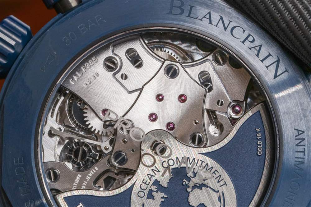 除了美學(xué)之外,一個很好的理由是寶珀五十噚深空飛返計時碼表內(nèi)部的機(jī)芯,這是內(nèi)部制造的寶珀口徑 F385 自動計時碼表。透過表殼背面可以看到機(jī)芯,不難看出它的設(shè)計和裝飾都很可愛。現(xiàn)代的線條和形狀裝飾著這款現(xiàn)代機(jī)械機(jī)芯,它也恰好擁有 5Hz (36,000bph) 的工作頻率。這與著名的 Zenith El Primero 相同,比大多數(shù)標(biāo)準(zhǔn) 4Hz 計時手表快 1Hz。