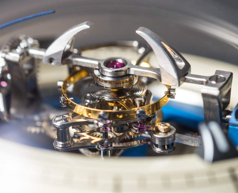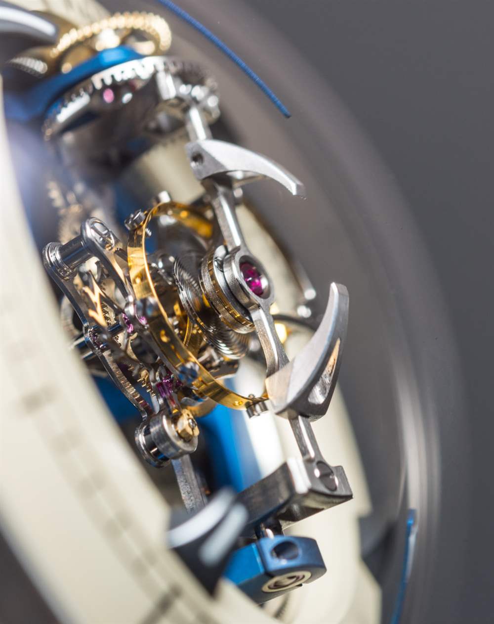 手表的核心是高度可見的三軸陀飛輪,它在表盤中間向不同方向跳舞。有兩個獨特的藍色指針環繞表盤指示小時和分鐘。如果你仔細看,你會發現分針每分鐘跳一個位置——這很酷。