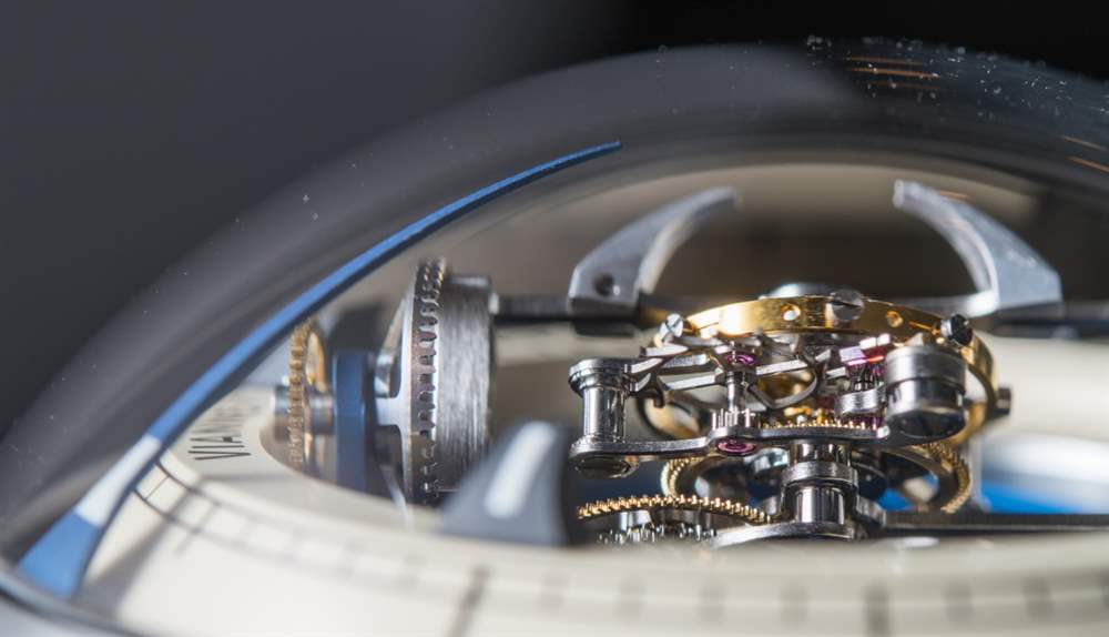 第一個陀飛輪軸點每30分鐘轉一圈;第二次,每六分鐘;第三次,每分鐘。這是機械動畫藝術,它可以很好地拉動任何齒輪頭的情感心弦。真的,觀看 Vianney Halter 深空陀飛輪及其 calibre VH 113 機芯是純粹的手表色情……我的意思是盡可能以最好的方式。我們能夠在圖像中很好地捕捉到手表,因為它具有圓頂水晶,令人驚訝的是上鏡。如果處理不當,這些晶體通常會受到大量眩光的影響,而這里的情況并非如此。佩戴舒適度和適當享受表盤內部的能力等小細節使Vianney Halter深空陀飛輪在主題下特別精致。