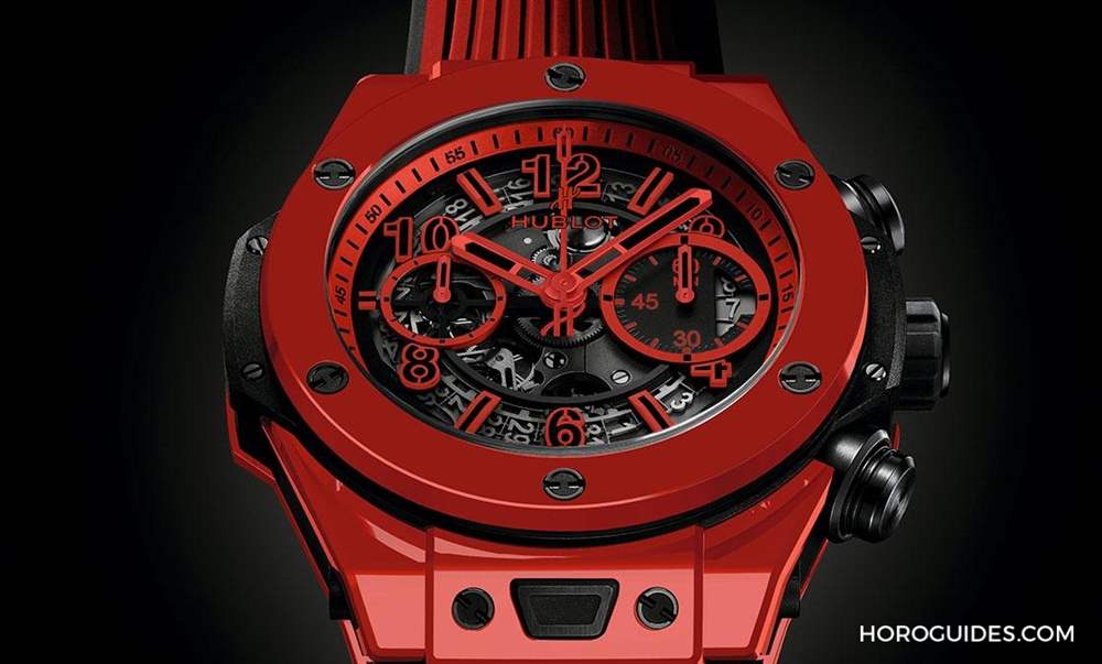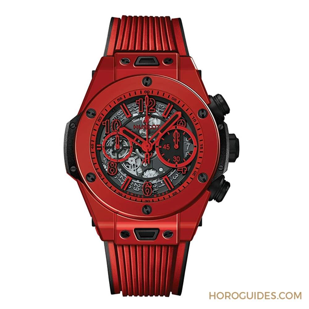 BIG BANG UNICO RED MAGIC表徑45mm,搭配自制HUB1242 UNICO自動(dòng)上鏈飛返計(jì)時(shí)導(dǎo)柱輪機(jī)芯,表殼與表冠皆由宇舶專利魔力紅陶瓷所打造,限量500只。