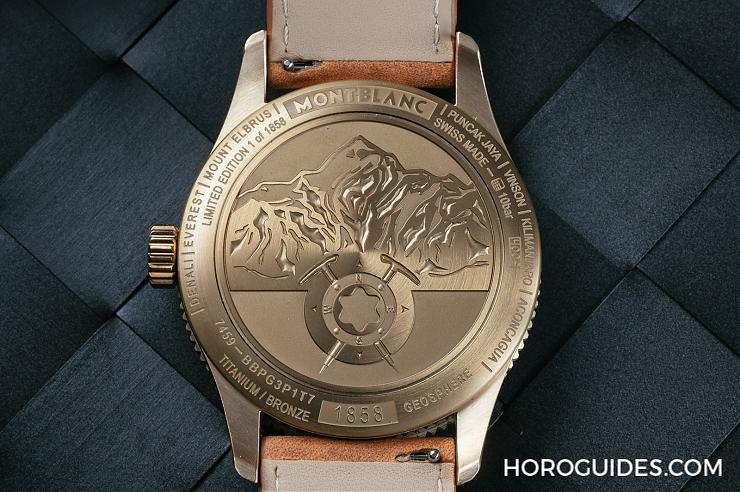 這次2018萬寶龍1858系列最基本的雙針款,表徑40mm,不銹鋼表殼搭配上青銅表圈,價格上也是1858系列先款中最便宜的一只,約臺幣86,100(約港幣2萬左右),表底蓋同樣刻飾了「山峰探險」的Montblanc山峰圖像。