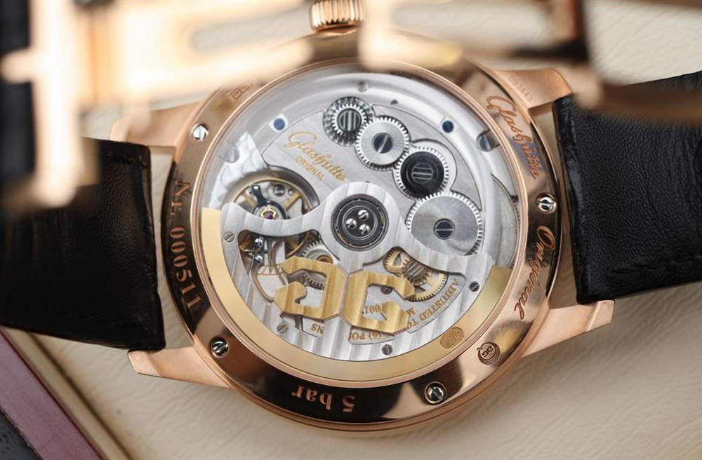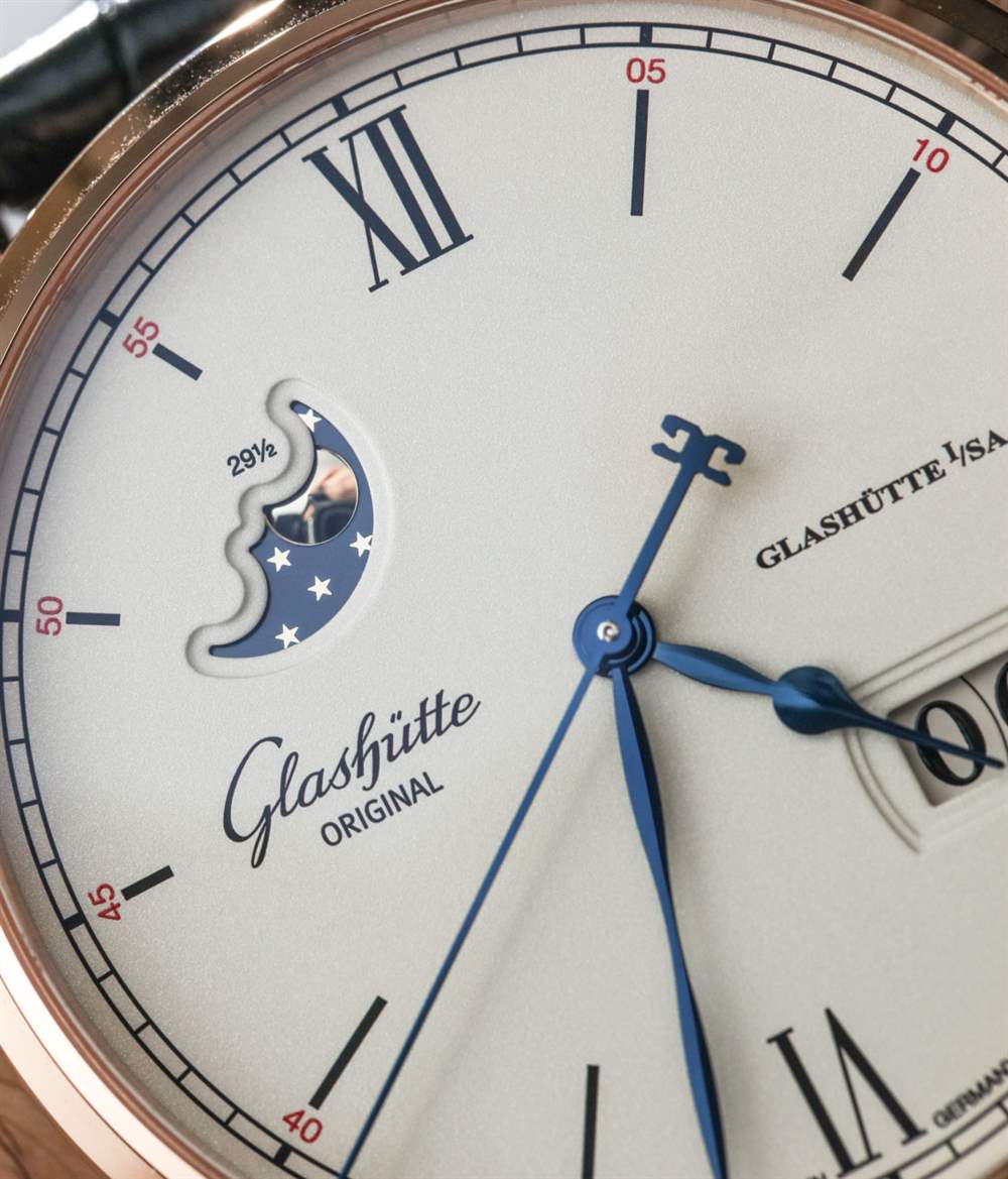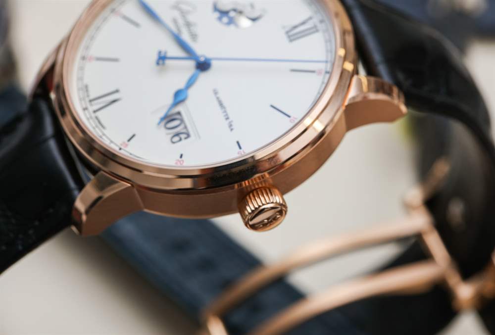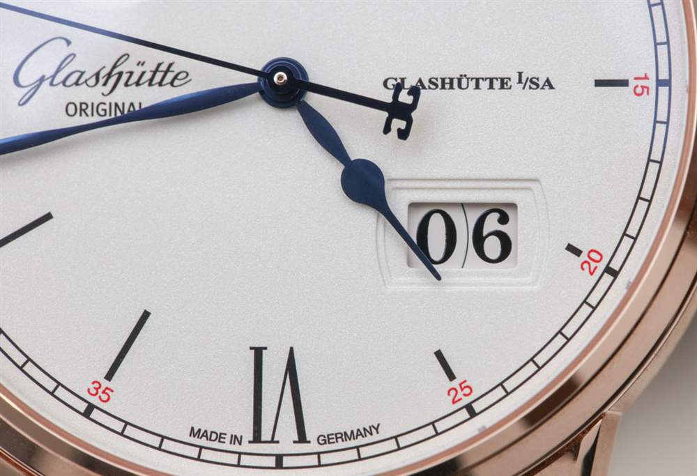 其他受歡迎的設計元素是對表盤設計的微調,略顯精致,非常帥氣。藍鋼指針尺寸完美,一切清晰易讀。部分原因是格拉蘇蒂原創在幾年前收購了他們的 Pforzheim 表盤供應商,并嚴格控制表盤生產(包括日期輪等),以最大限度地提高表盤的美觀和易讀性。請注意紅金表款表盤上的紅色點綴,營造出漂亮、略帶運動感的個性。對我來說,這個元素提醒我,這些不僅僅是漂亮的手表,也是德國手表傳統中的工具。