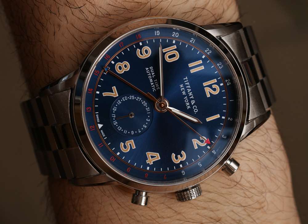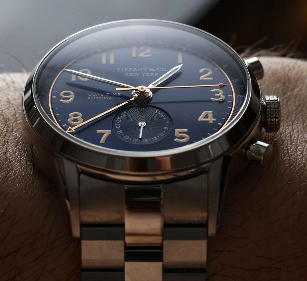 表盤上一個古怪的設計決定是如何使用“雙時間”和“自動”標簽。蒂芙尼 (Tiffany & Co.) 將表盤左側的字樣堆疊在一起,使表盤看起來有點不對稱。我想知道他們為什么不只采用這兩個術語(視覺尺寸大致相同),而是將一個放在表盤的左側,一個放在右側。也許他們對此進行了試驗,但看起來效果不是最好,但它似乎可以增強視覺對稱性。廣告留言廣告信息結束