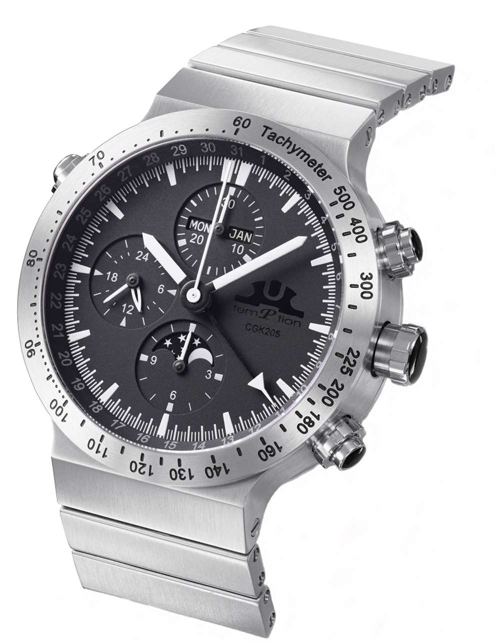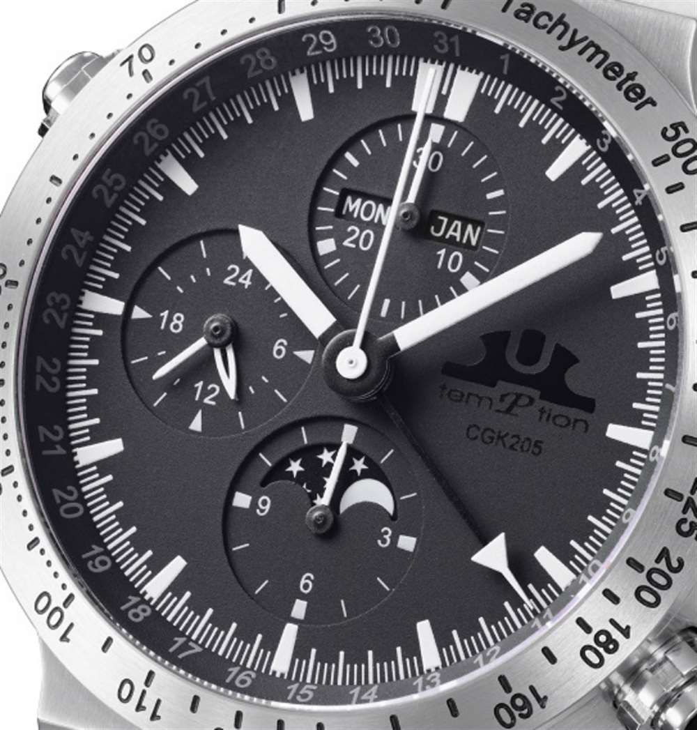 Temption CGK205 表殼寬 43 毫米,采用精工拉絲鋼制成。技術規格很少,但根據 Temption 的說法,這款手表連同表鏈重 190 克,真皮表帶重 129 克。表盤上有一塊鍍增透膜的藍寶石水晶,機芯上方的表殼后部也有一塊作為展示窗。腕表內部搭載瑞士ETA Valjoux 7751自動機芯。這是一款 7750,具有一些附加功能,例如完整的日歷、24 小時針(AM/PM 指示器——而非 GMT 指針)和月相指示器。