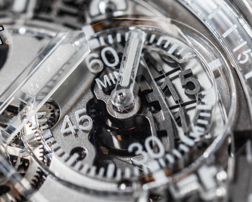 看著已經鏤空的表盤,感覺就像看到 Hublot Big Bang UNICO 手表的 X 光片。指針和時標上的涂漆 SuperLumiNova 保持了易讀性,但這里的概念是完全透明的……而且它有效。起初,看到透明指針在表盤上移動有點奇怪,但老實說,Jean-Claude Biver 是對的,這與全黑手表相反,但感覺很適合完全相同的主題。