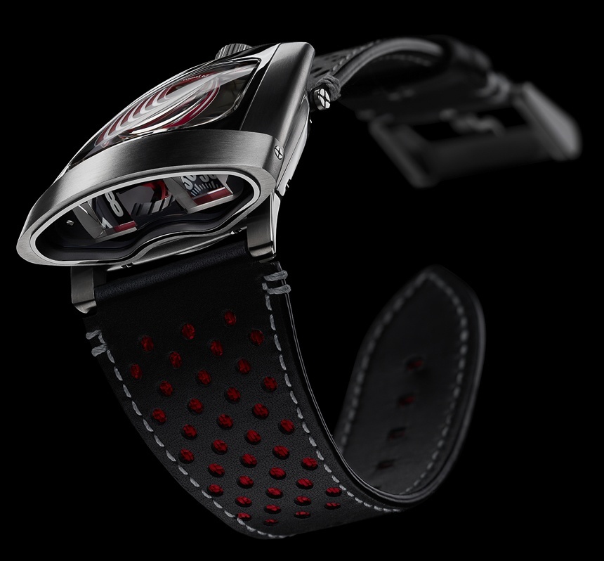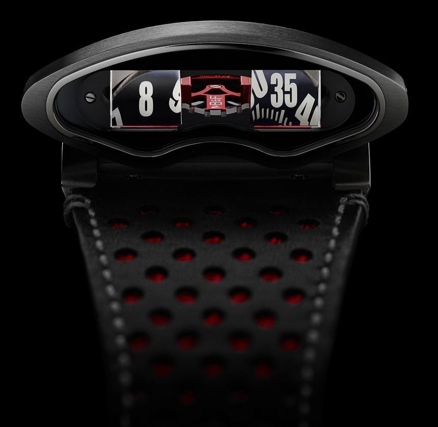 從材料的角度來看,MB&F HMX 表殼最簡單的一面是鈦和鋼。頂部有藍寶石水晶,可以看到機芯的“發動機艙”,前面是查看時間的地方,手表下面是放置 22k 金轉子的地方。只是我,還是表盤看起來像倒置的嘴唇?MB&F 并不是唯一一家受到汽車發動機艙啟發的手表制造商——HM5 中機芯的顯示方式尤其受到了法拉利的啟發。至少與 HM5 相比,一個有趣的變化是,使用 MB&F HMX,您可以通過藍寶石水晶看到機芯,您可以看到時間。