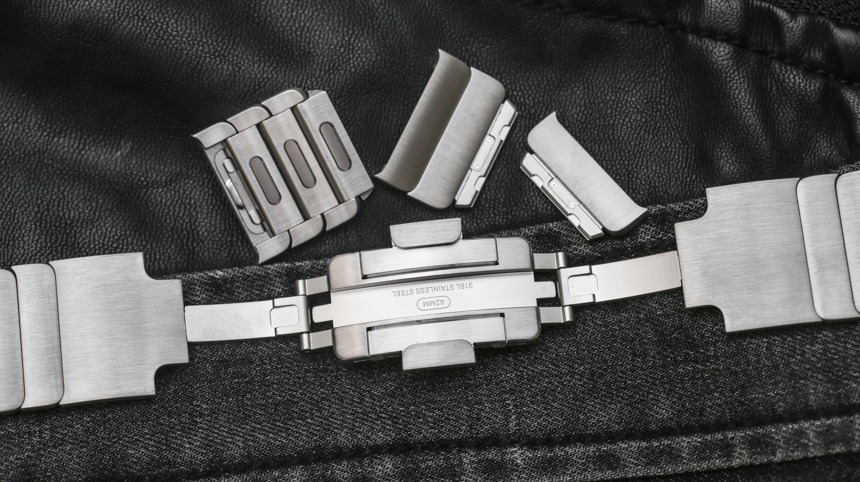 如果您選擇精美的“Link Bracelet”,您會(huì)發(fā)現(xiàn)很多很棒的細(xì)節(jié),首先是它的尺寸很容易調(diào)整。不需要任何工具,這個(gè)過程既直觀又精致,因?yàn)槟恍璋聪旅總€(gè)鏈接后面的小按鈕即可釋放它們。手鐲有一個(gè)蝴蝶式展開扣,設(shè)計(jì)巧妙,幾乎與手鐲的其余部分齊平。這讓我想起了舊的勞力士手鐲——在一些型號上,比如潛航者,它有厚而丑的展開部分(謝天謝地,他們設(shè)計(jì)出來了)——考慮到蘋果公司恰恰相反,他們的解決方案非常薄。