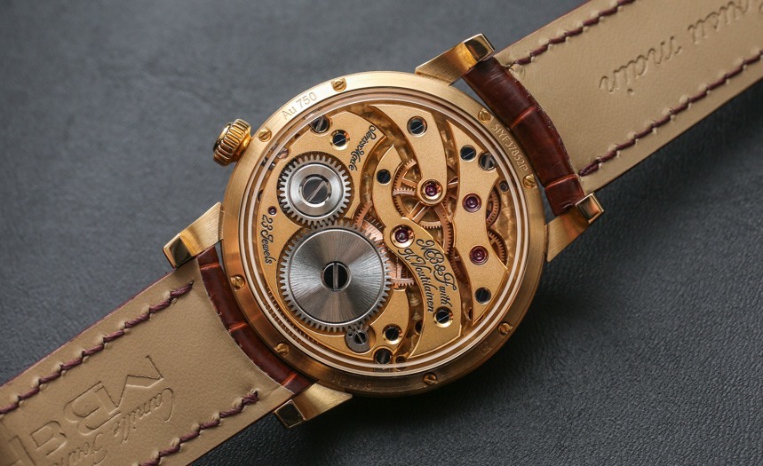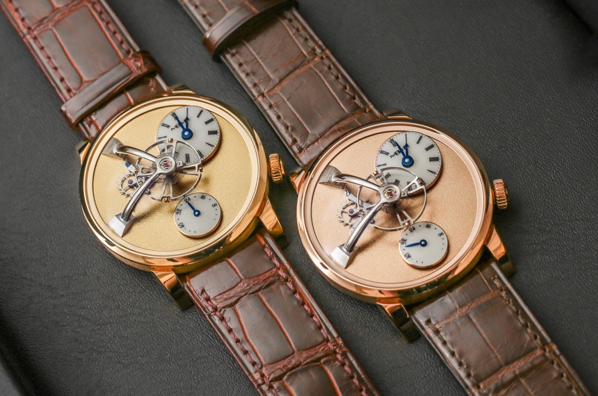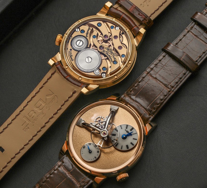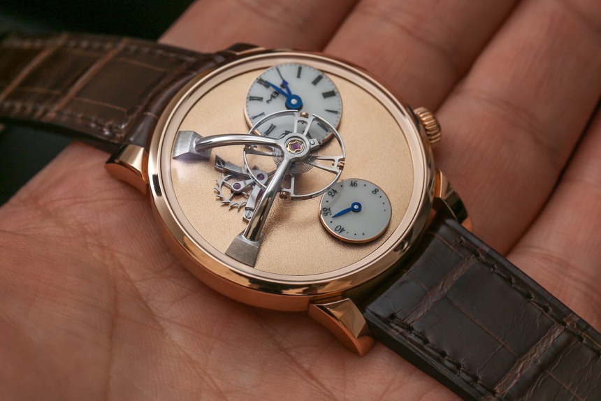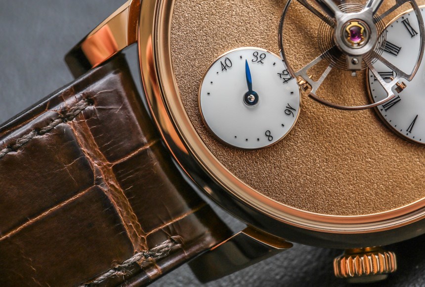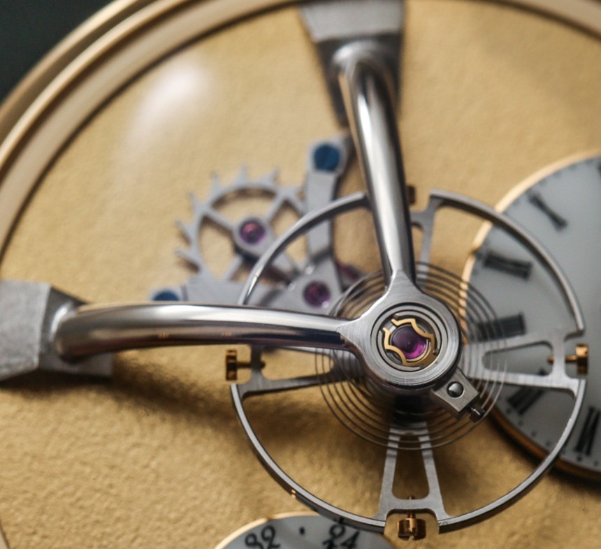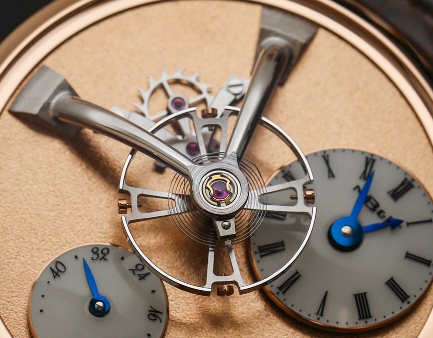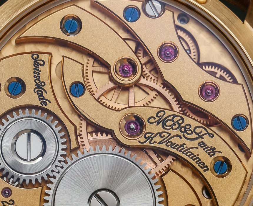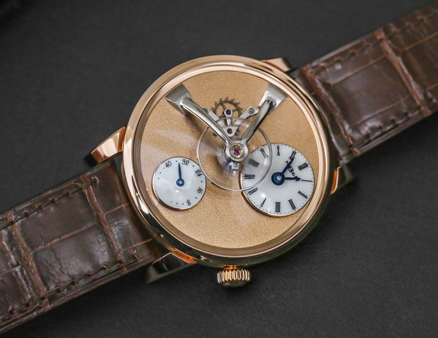 機芯以 18,000 次/小時(2.5 赫茲)的頻率運行,表盤中央有一個 14 毫米寬的大擺輪,并通過高架橋固定在主表盤上方。機芯手動上鏈,動力儲存 45 小時。手表的表面提供了很大的空間來享受磨砂表面,6 點鐘位置有一個動力儲存指示盤以及一個偏心表盤。