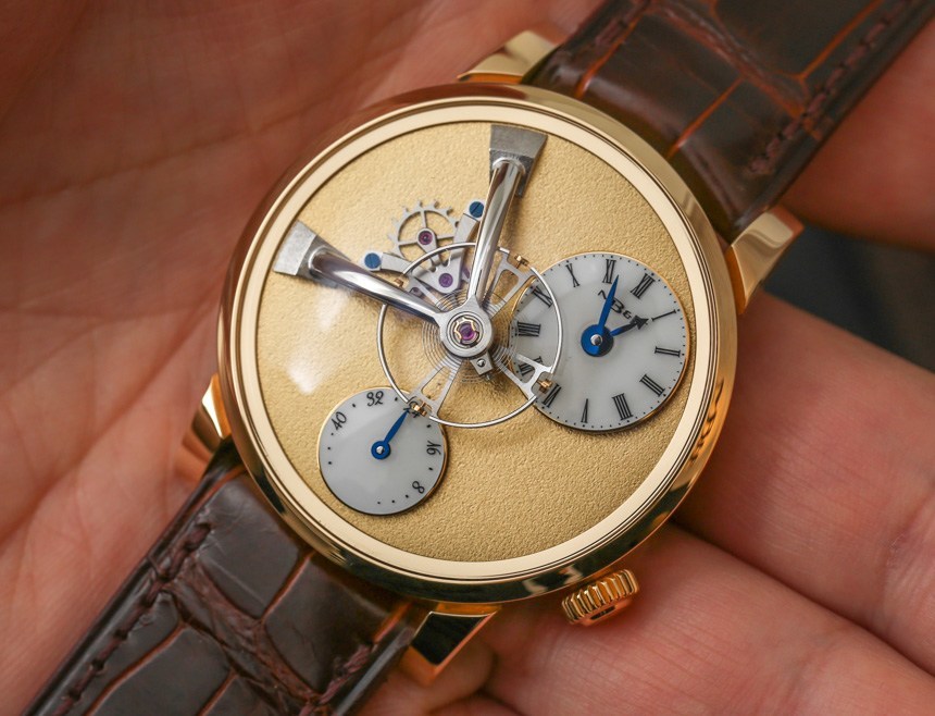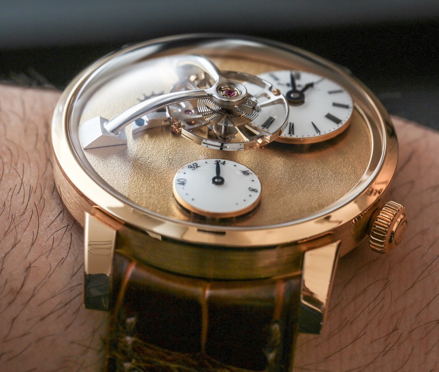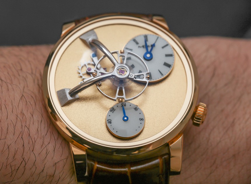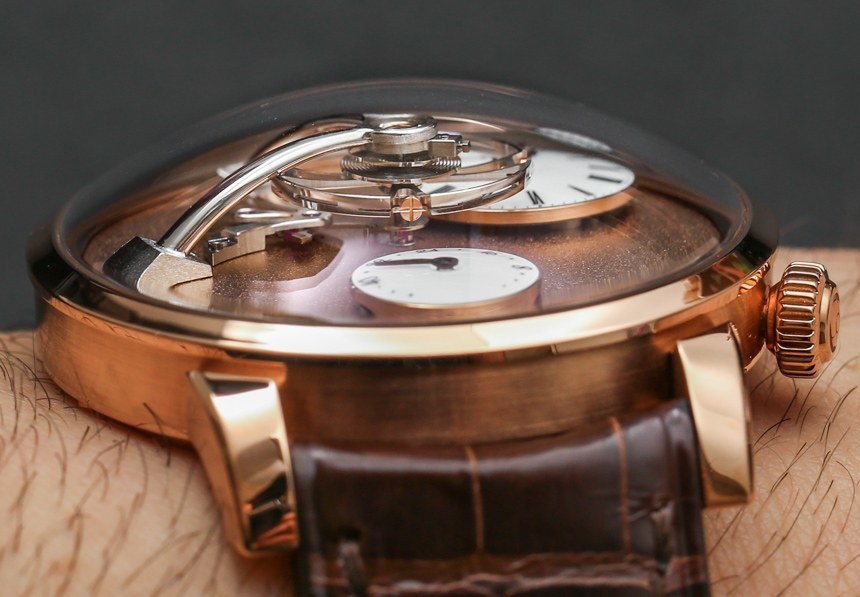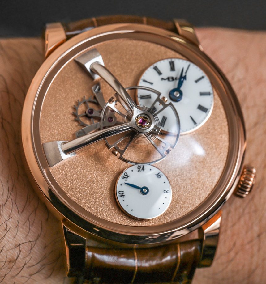 鑒于外露的擒縱機構和擺輪,表盤具有很多視覺美感和動感。雖然我仍然最喜歡 MB&F LM1,但 LM101 提供了有趣且平衡的表盤設計,盡管是不對稱的。值得注意的是,霜凍表盤是手工完成的。雖然過去曾使用各種技術來獲得類似的外觀(其中一些非常有毒),但 MB&F LM101 Frost 表盤是使用金屬刷工具制作的,該工具用于精心制作表盤。這種手工制作方法的挑戰在于讓整個表盤看起來均勻。