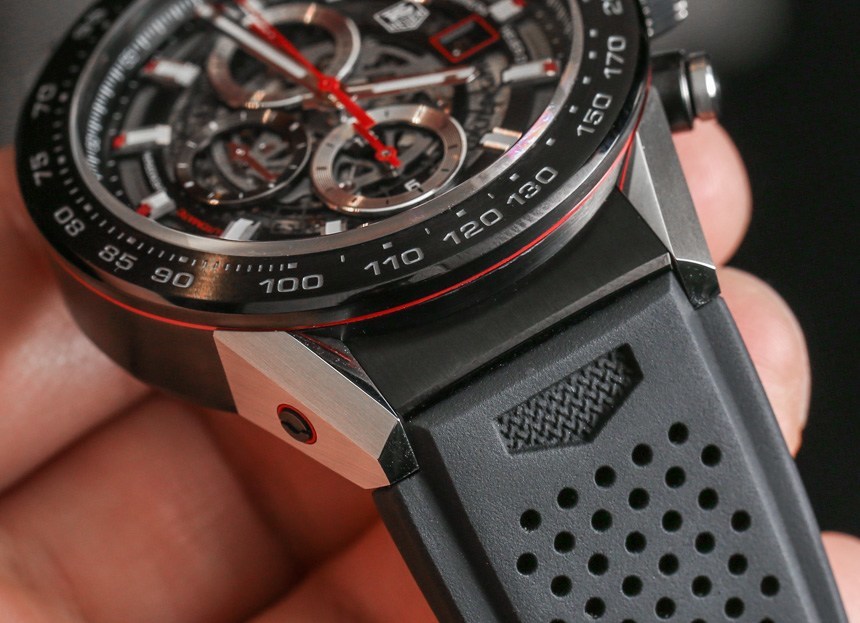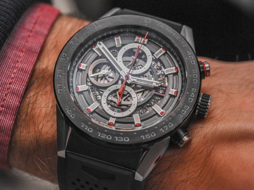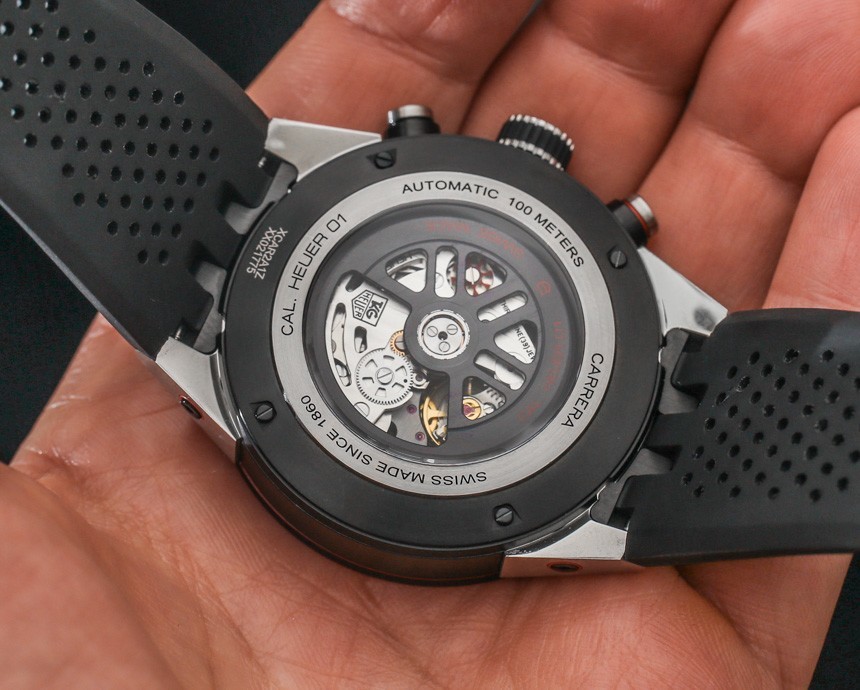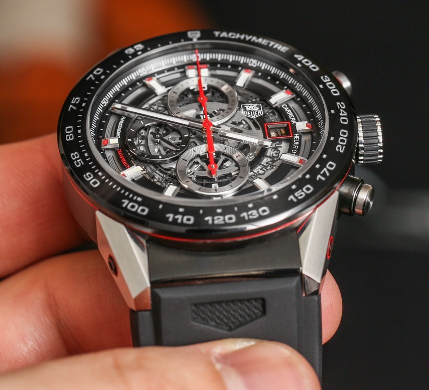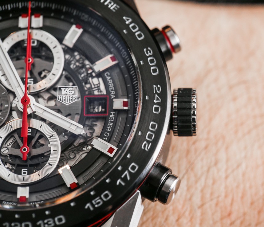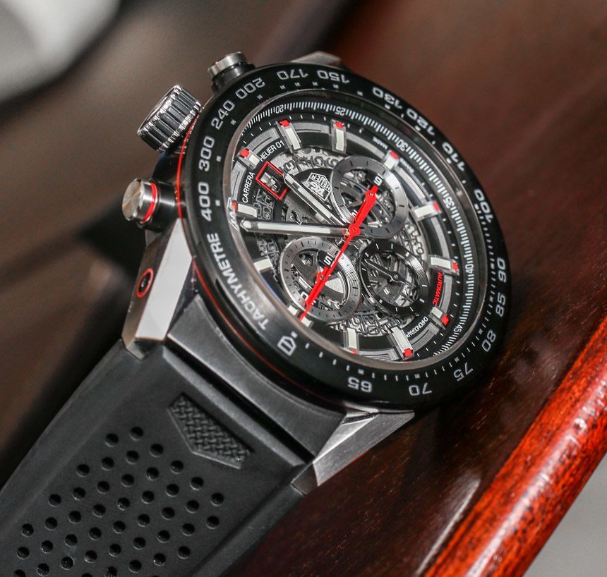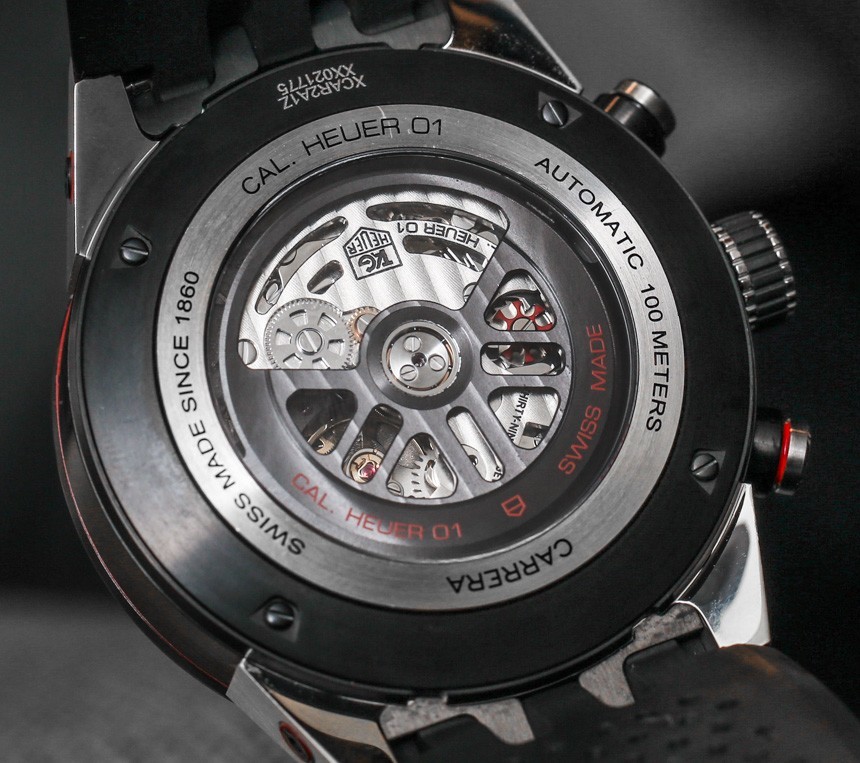 45 毫米寬的 TAG Heuer Carrera Calibre Heuer 01 手表采用黑色、鋼和紅色表殼,在圖片上看起來不像在手腕上那么漂亮。大膽的 Big Bang 風(fēng)格鏤空表盤和指針看起來很酷,整體設(shè)計有趣而令人興奮,就像泰格豪雅已經(jīng)有一段時間了。2015 年左右的機械表的魔力在于機械機芯,聰明的公司知道如何向愛好者展示該機芯。