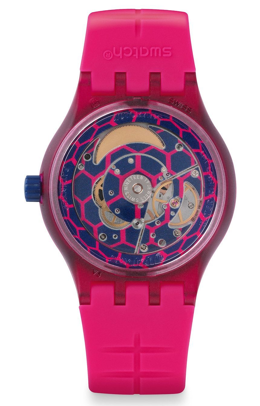 Swatch 將 Sistem51 的尾部設計成各種裝飾圖案,看起來有趣有趣。自動轉子實際上是透明的,可以通過手表的透明塑料底蓋更好地觀察。機芯提供帶有中央秒針和日期指示器窗口的時間。