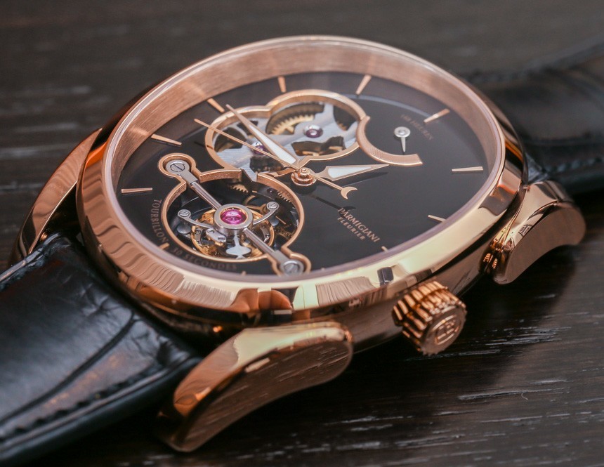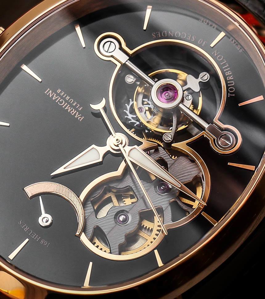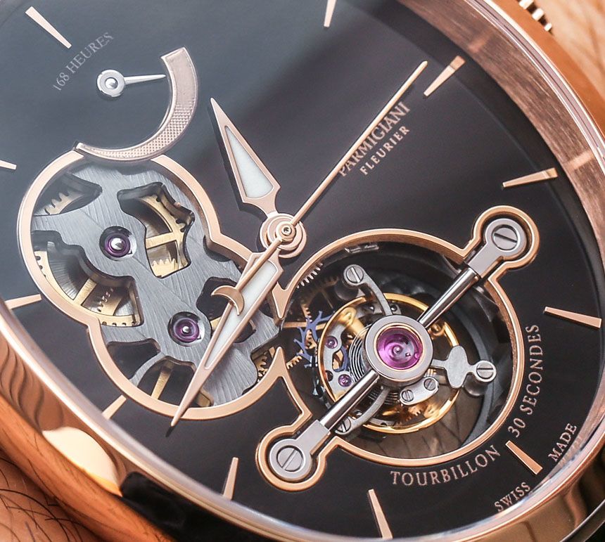 手表內部是內部制造和設計的 Parmigiani Calibre PF501 手動上鏈機芯,具有整整一周的動力儲存。這是通過表盤頂部方便的動力儲存指示器測量的,指示完整的 163 小時動力儲存。機芯以 3Hz(21,600 bph)運行,陀飛輪的獨特之處在于它每 30 秒旋轉一次,而不是每 60 秒旋轉一次。您還可以注意到機芯中硅部件的使用,例如擒縱機構。