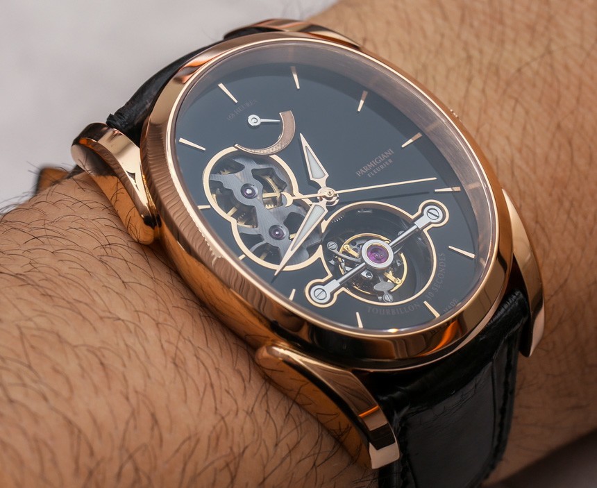 Parmigiani Ovale Tourbillon 表殼寬 37.60 毫米,高 45 毫米。表殼厚度約為 12 毫米。如果這些數字難以翻譯,只需看看手表在我手腕上的佩戴方式即可。彎曲的表耳防止手表看起來像伸出手腕較小的邊緣,設計的彎曲特性使其佩戴起來相當討人喜歡。當然,外觀非常標新立異,但花這種錢的時候,大多數人并不想融入其中。至少 Parmigiani Ovale 表殼的設計“與眾不同”。