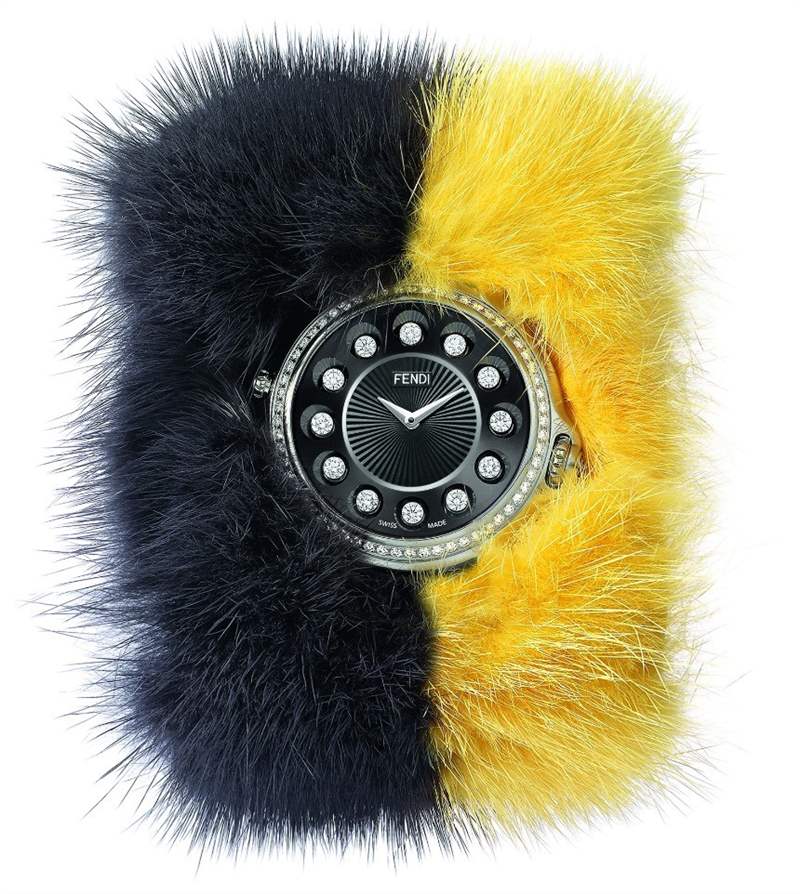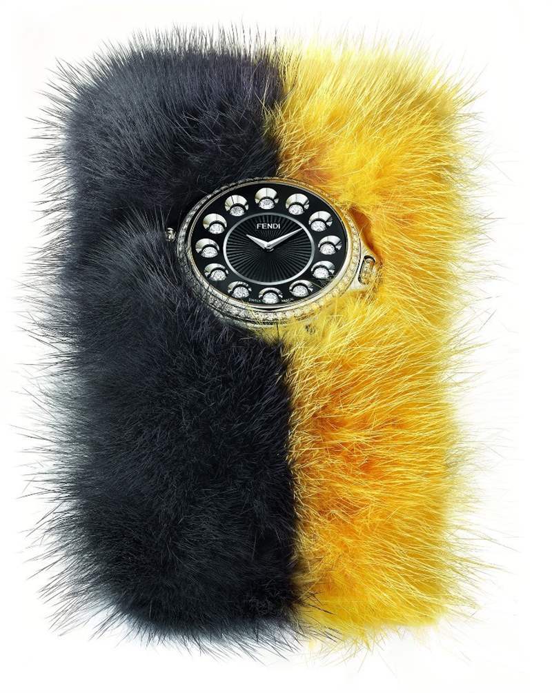 看到表殼上用于小時指示器的那些寶石了嗎?它們的設置方式使得每個人都可以旋轉。每個“單位”實際上是鑲嵌三顆寶石,佩戴者使用表冠同時轉動它們以顯示鉆石時標、粉色藍寶石時標或藍色藍寶石時標。芬迪將這種面向時尚的功能描述為允許佩戴者改變寶石的顏色以匹配他們的心情。然而,大膽的黑色和黃色皮草表帶以某種方式與所有心情相得益彰?廣告留言廣告信息結束
