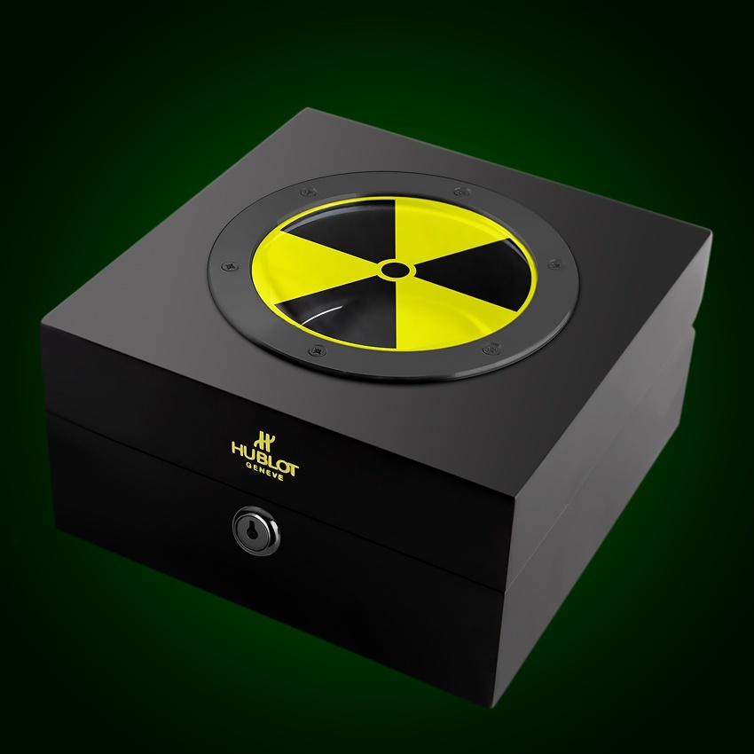 Hublot 決定將 Atomic D-38 基于其新的 45 毫米寬更新 Big Bang 表殼,并開發(fā)一種特別適合手表放射性特性的獨(dú)特復(fù)雜功能。Hublot 理解,甚至建議訂購 Atomic D-38 的顧客不要一直佩戴它。事實上,就像陳年烈酒一樣,一次只能喝少量。當(dāng) Big Bang Atomic D-38 腕表不使用時,宇舶表提供了一個鉛質(zhì)展示盒,用于存放未佩戴的腕表,以保護(hù)兒童和動物的生命安全。