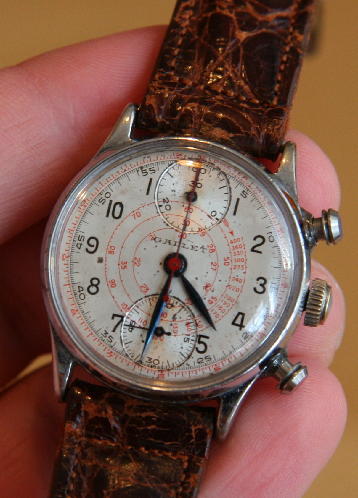 我的實驗標本是剛修復的Gallet。我對手表了解不多,因為它非常罕見。但我可以估計它很可能是在 1940 年代初至中期(可能是 1930 年代)制造的。這只手表是我的祖父,當我得到它時,它年久失修(無法工作,缺少水晶,劇烈氧化)。它現在又起作用了,在我的手腕上。修復過程的細節我就不多說了,但是由于找零件的困難,這個修復項目遠遠超出了常規,花了大約一年的時間坐在那里等待零件。我大部分原創的Gallet以一種令人印象深刻的但明顯的復古狀態回到了我身邊。我遠離古董這個詞,因為這意味著過時,而這里的情況并非如此。人們可以買到一款完美的現代手表,其機芯和功能與這款小Gallet相似。