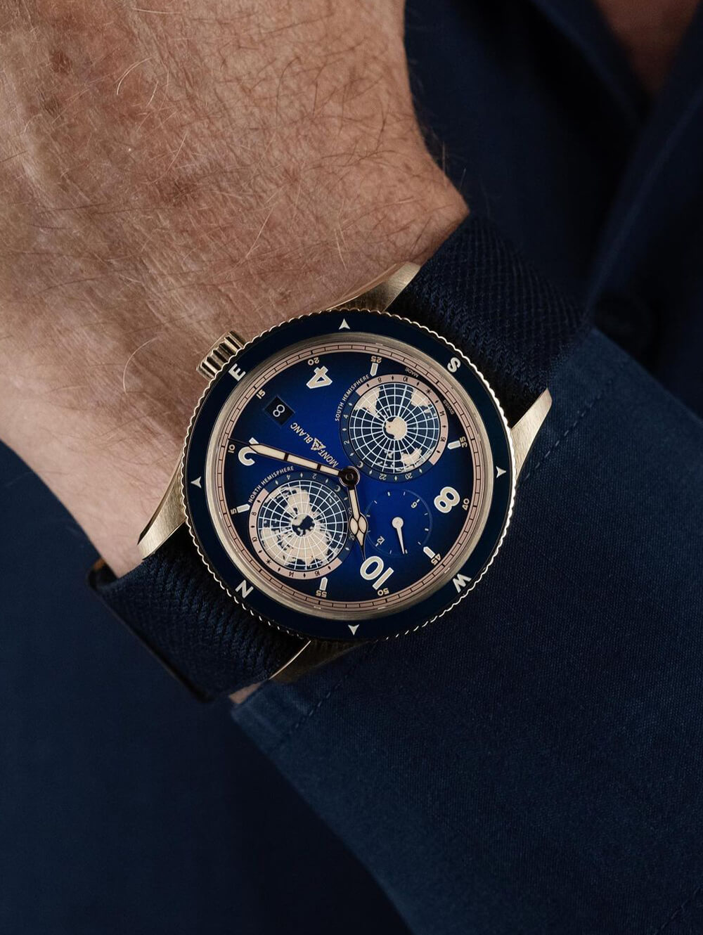新款 Geosphere 的機(jī)芯和尺寸與該系列中的其他產(chǎn)品相同——也就是說,具有 42 小時(shí)動(dòng)力儲(chǔ)存和 42 毫米表殼的 Calibre MB 29.25 自動(dòng)機(jī)芯。它還使用了去年萬寶龍限量版 Geosphere 的青銅色,不過卡其綠色改為藍(lán)色。