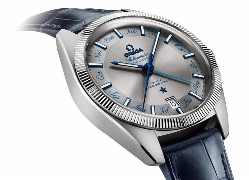 最為獨特的或許是星座系列旗下尊霸41毫米至臻天文臺年歷腕表。其太陽射線打磨灰色「派盤」表盤令人聯(lián)想到1952年首款星座腕表。表盤上每一個刻面都標記月份名稱,成為年歷指示功能的組成部分,以藍鋼指針指示月份。此外,其日歷也十分特別地被安排在了6點位上,同樣清晰易讀。搭配藍色皮表帶,低調(diào)而文雅。