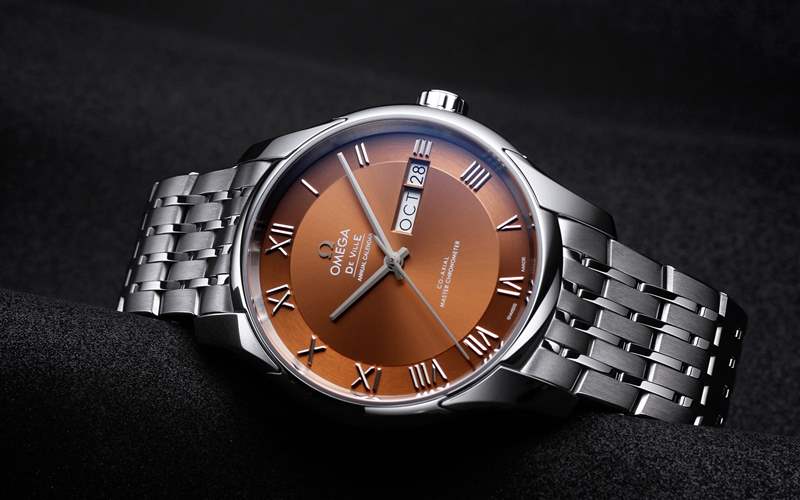 同一系列的?AQUA TERRA 150米43毫米同軸年歷腕表,除了其標志性的「柚木概念」灰色表盤之外,富貴的粉金表殼與粉金表帶,加上直徑43毫米的大尺寸都讓人感覺到其富貴逼人的氣勢。