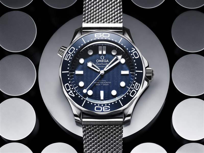 海馬系列300米潛水表42毫米至臻天文臺表詹姆斯·邦德60周年紀念腕表鋼殼鋼鏈款。同樣為了慶祝007系列電影上映60周年而推出,表殼尺寸為42毫米,采用不銹鋼材質打造,藍色表盤以草酸陽極氧化鋁制成,飾以激光鐫刻波紋圖案,靈感源自詹姆斯·邦德在1995年上映的電影《黃金眼》(Golden Eye)中所佩戴的海馬系列300米潛水表。潛水刻度上的傳統倒三角標志則以數字「60」取代,別具紀念意義。該表搭配經過拉絲處理的精鋼網狀表鏈,為其金屬外觀增添紋理質感,呼應邦德在電影《無暇赴死》(No Time To Die)中佩戴的鈦金屬表所搭配的優雅網狀表鏈,比較少見而別致。