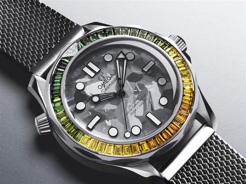 對于007詹姆斯·邦德「專屬」海馬300表款著迷的鑒賞家與收藏家大有人在,如今他們有了最新的選擇:為了慶祝007系列電影上映60周年,歐米茄新推出了奢華旗艦級產品海馬系列300米潛水表42毫米至臻天文臺表詹姆斯·邦德60周年紀念表 Canopus 18K金款。該表采用 Canopus 18K金打造,搭配天然灰色硅質表盤,呼應特工007藏身加勒比海時的沙灘。表盤搭配單向旋轉表圈,其上鑲嵌著不同色澤的鉆石,使得表圈整體呈現出由暗綠色至黃色的漸變效果,十分引人注目。藍寶石玻璃表背飾以微結構金屬噴鍍技術制成的圖案,再現007系列電影的經典開場——邦德剪影和螺旋形槍膛線。這種「摩爾」紋的動態效果與「棒棒糖」型中央秒針同步運行,循環往復,特別具有趣味性。