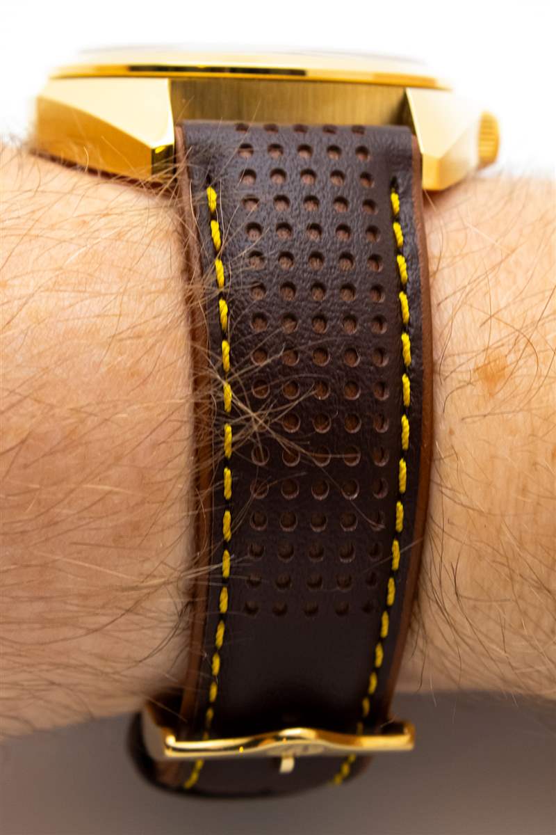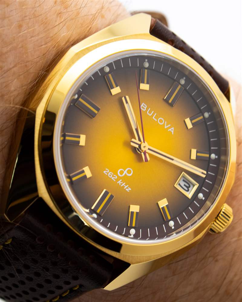 雖然 Bulova Jet Star 的表盤布局可能相對簡單,但正是這種簡單設計的執行使表盤脫穎而出。不銹鋼型號有深梅洛紅或限量版銀色可供選擇,但我們的金色評測型號配備了豐富、時髦的“奶油糖果”表盤配色。與傳統的明亮黃金色調不同,這款略帶紋理的旭日紋表盤以接近純蜂蜜顏色的近乎琥珀色色調開始。由于表盤的漸變效果,外部分鐘刻度逐漸變成深巧克力棕色,從而在表盤上呈現出美妙的暖色調。它一點也不微妙,就像巴里·吉布 (Barry Gibb) 身上的聚酯纖維西裝一樣,大約是 70 年代的風格,但這帶來了自己品牌的引人注目的魅力。簡單的條紋棒形指針和配套的棕色涂層立體時標避免了這種外觀過于復雜的情況,并牢牢地植根于其 70 年代祖先的背景,旁邊的 12 點鐘位置印有老式 Bulova 標志。一些純粹主義者可能會對 3 點鐘窗口使用白色日期輪表示不滿,但這在很大程度上也是正確的。稍微偏離表盤感覺的是紅色針秒針。這款指針每秒 16 次的流暢掃描與通常每秒一次的石英秒針相比是一個有趣的變化,但紅色調可以說太亮又太柔和,不適合真正的設計。雖然黑色或深棕色秒針可以干凈利落地融入整體調色板,寶路華 (Bulova) 的紅色顏色太暗、太柔和,無法真正形成有效的對比效果。更具活力的猩紅色很可能解決這個難題,同時保持當前風格不變。