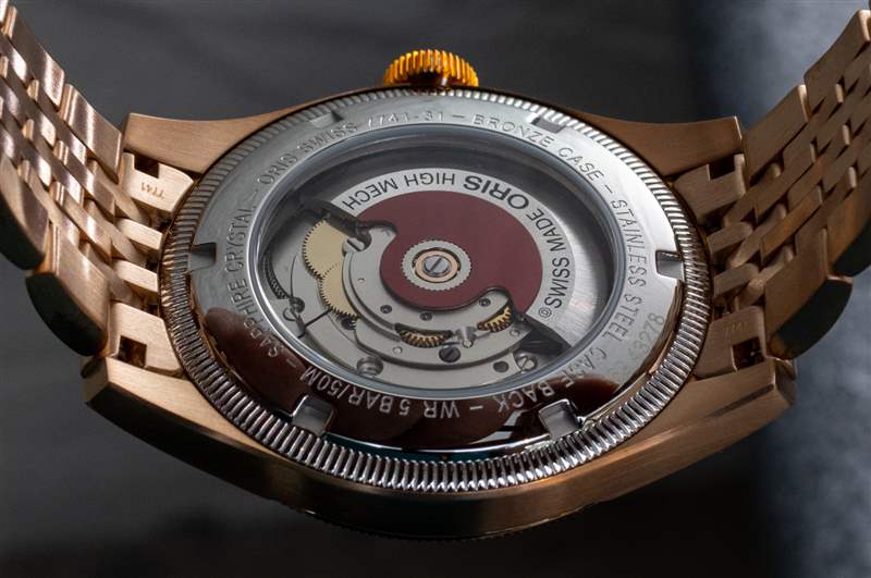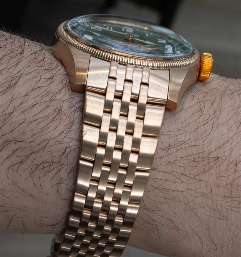 當然,這個新系列的豪利時大皇冠指針日期模型最大的吸引力之一就是它的全青銅表鏈。Oris 之前曾在 Divers 65 系列中嘗試過青銅表鏈的概念,但這是 Big Crown Pointer Date 第一次得到同樣的處理。然而,真正使它與 Diver 65 迭代不同的是,首先要完全用青銅制作手鐲的難度。由于青銅是一種較軟的金屬,因此在手鏈中加工每個單獨的鏈節以使其均勻貼合可能比使用鋼制更棘手,因為后者品牌很習慣于塑形。除此之外,還有銅綠因素需要考慮。銅綠實際上生長在青銅表面的外側,隨著這一層變厚,隨著公差的縮小,它可能會使手鏈鏈節變粘。最后,有一個問題是青銅銅綠可以通過摩擦擦掉,沒有人想要在他們的皮膚上留下一個綠色的銅綠環。Divers 65 手鏈的三連桿結構使這些問題更容易解決,但 Oris 在這里使用的多連桿設計有更多的活動部件,并提供更多的地方讓銅綠隱藏和堆積。Oris 通過在手鐲底部涂上一層抑制銅銹的涂層解決了大部分這些問題,但這款手鐲的加工水平本身也令人印象深刻。在手腕上,它肯定會引起注意,但它也引起人們注意鋼和青銅之間的另一個區別:重量。青銅的體積比不銹鋼重約 10%,雖然這種差異不像金殼手表那么大,