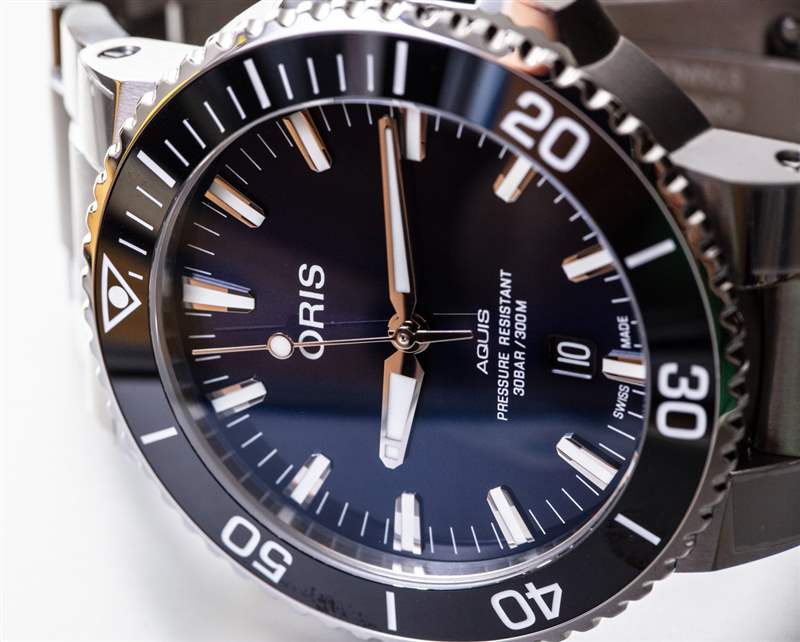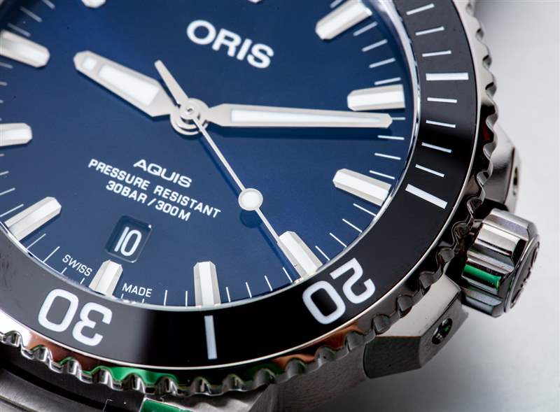 多年來,我開始欣賞 Oris 對許多 Aquis 型號的潛水表表盤的看法。在這里,我們看到了對核心美學的非常純粹的執行,我相信它定義了這條線。首先,您擁有獨特的粗體和錐形指針,以及同樣獨特的應用時標。表盤有很多拋光元素,但指針、標記和表盤之間的高對比度使得易讀性非常好。更閃亮的元素賦予手表更高端的外觀,讓 Oris Aquis Date 擁有奢華的外觀,同時也是一款嚴肅的工具手表。我最喜歡表盤的部分是對稱性以及日期(對稱地放置在 6 點鐘上方而不是更常見的 3 點鐘位置)并沒有完全切掉放置在它旁邊的小時標記。另請注意日期如何使用黑色與白色光盤很好地融合在一起。Oris 在這里也必須不常見,通過在表盤上寫半模糊(并且考慮到防水等級標簽也是多余的)“耐壓”術語。