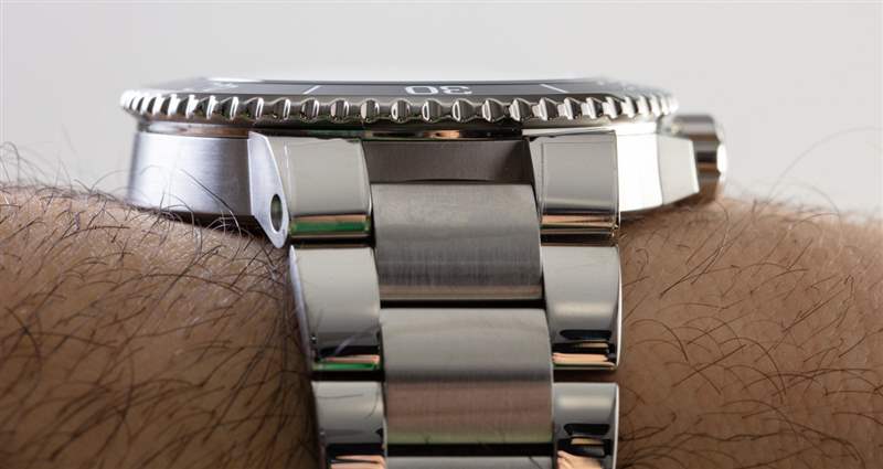 鑒于手鏈如此厚實,表耳處的寬度為 24 毫米,為了佩戴舒適,它明顯變窄。我確實喜歡手鐲端耳的樣式,當然,Oris Aquis 的可用橡膠表帶也有類似的體驗。話雖如此,但大自然有專有設計,如果您不想使用 Oris 提供的表帶或手鏈,則只能使用 Oris 或其他特殊形狀的表帶和手鏈。